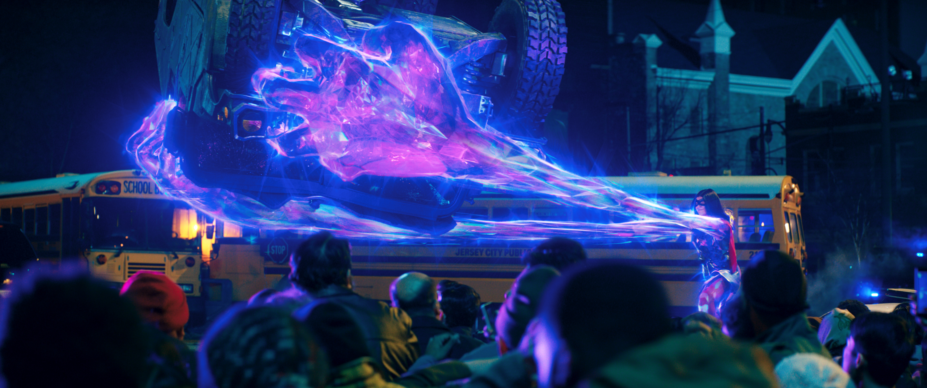 Wearing her new costume, Khan used her "hard light" energy construct platforms to quickly move throughout Jersey City. She eventually found Bruno Carrelli and Kamran hiding in an alley. As Khan and Carrelli hugged, Kamran accidentally let out bursts of energy in pain. The three of them made their way toward Coles Academic High School in order to hide from Damage Control. Khan then called Kareem and told him that she needed to get Kamran out of the country. Kareem told her that he knew someone who could help and she needed to get Kamran to the harbor by midnight.