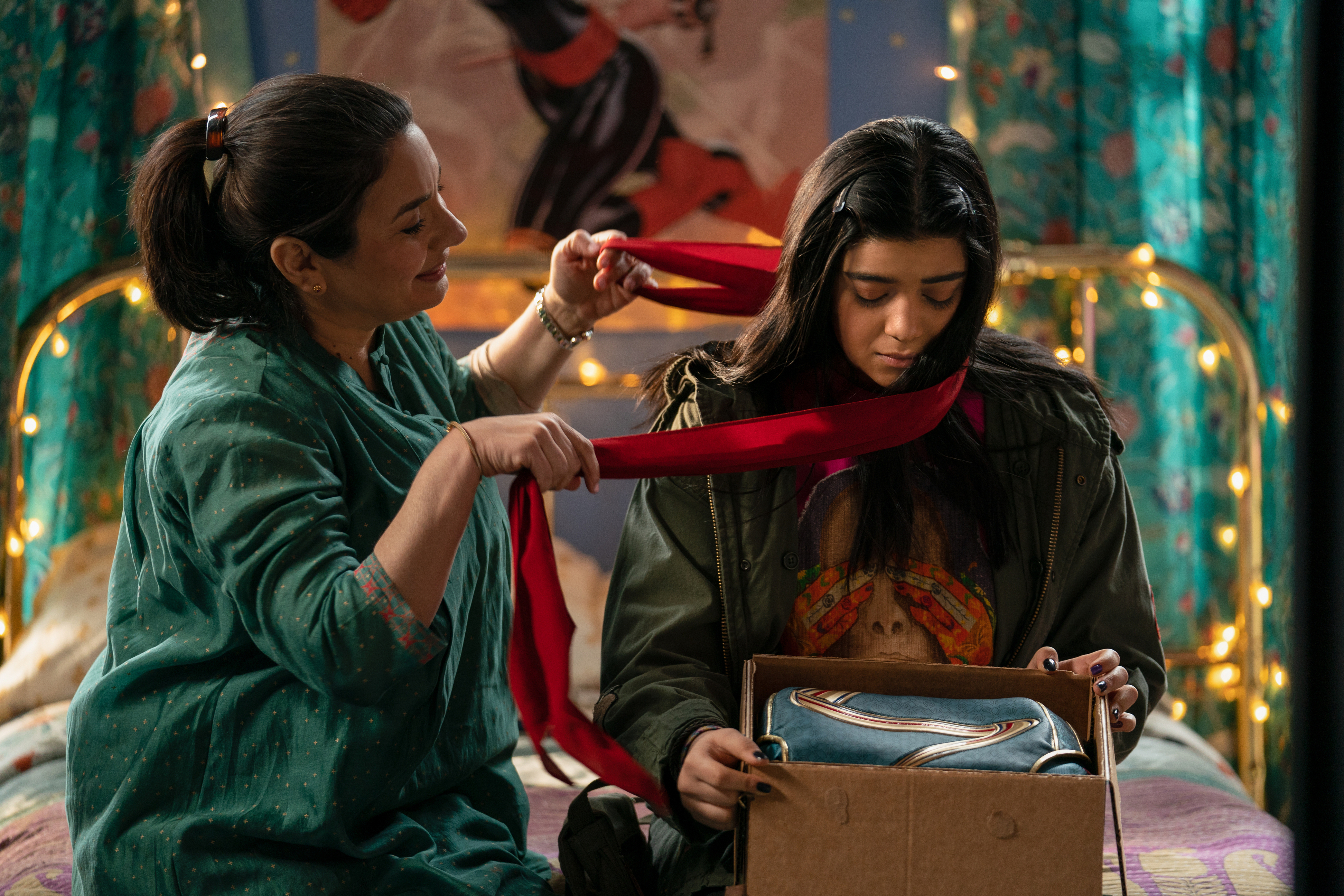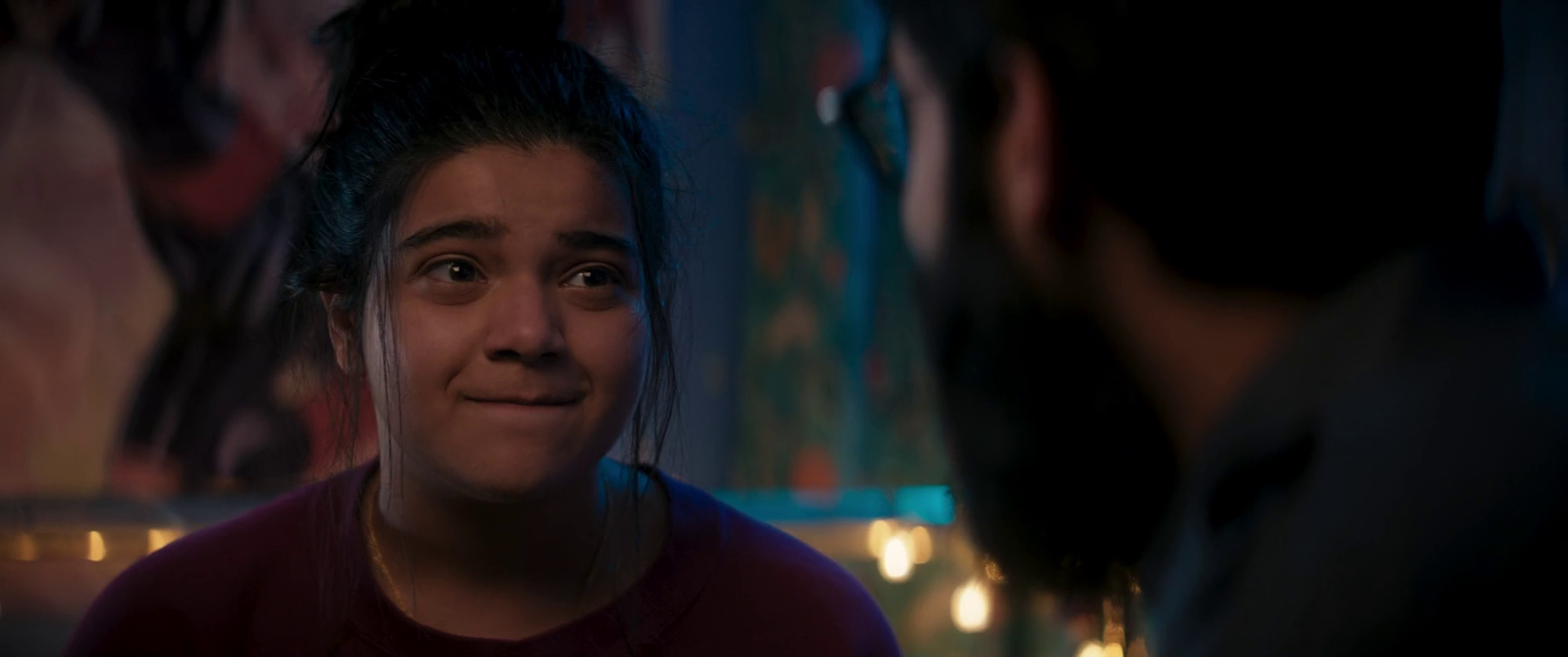 Her mother entered her room and told Khan that she and her father had talked with her brother and had decided to let her go to AvengerCon on some special conditions: her father would drive her, she would only be allowed to stay for two hours, and some would have to wear a specific costume. Her mother then revealed a homemade Hulk-inspired outfit. Suddenly, her father burst into the room in his own Hulk costume, wearing an all-green suit and green face paint. When Khan got mad and told them it was humiliating, her mother walked out in disappointment. Her father then sadly told her she was not going and left.