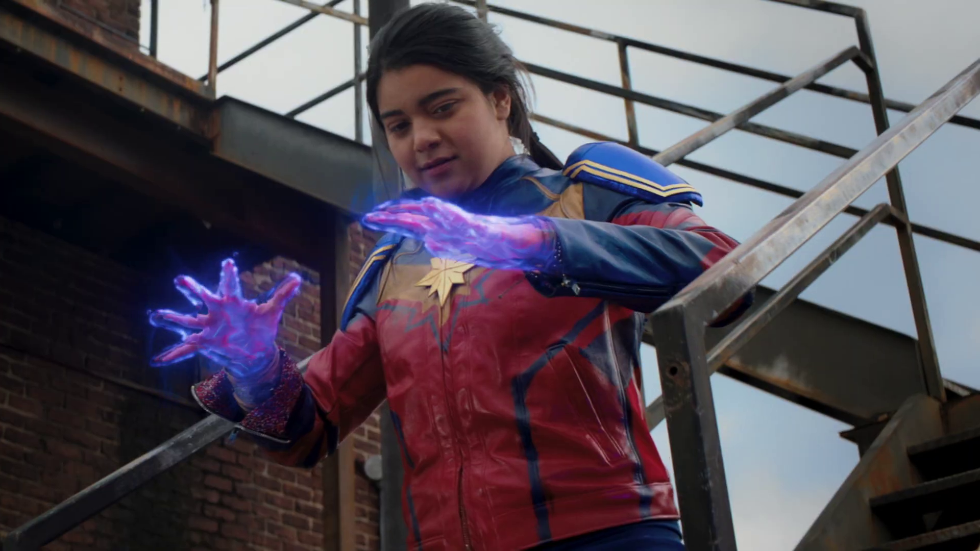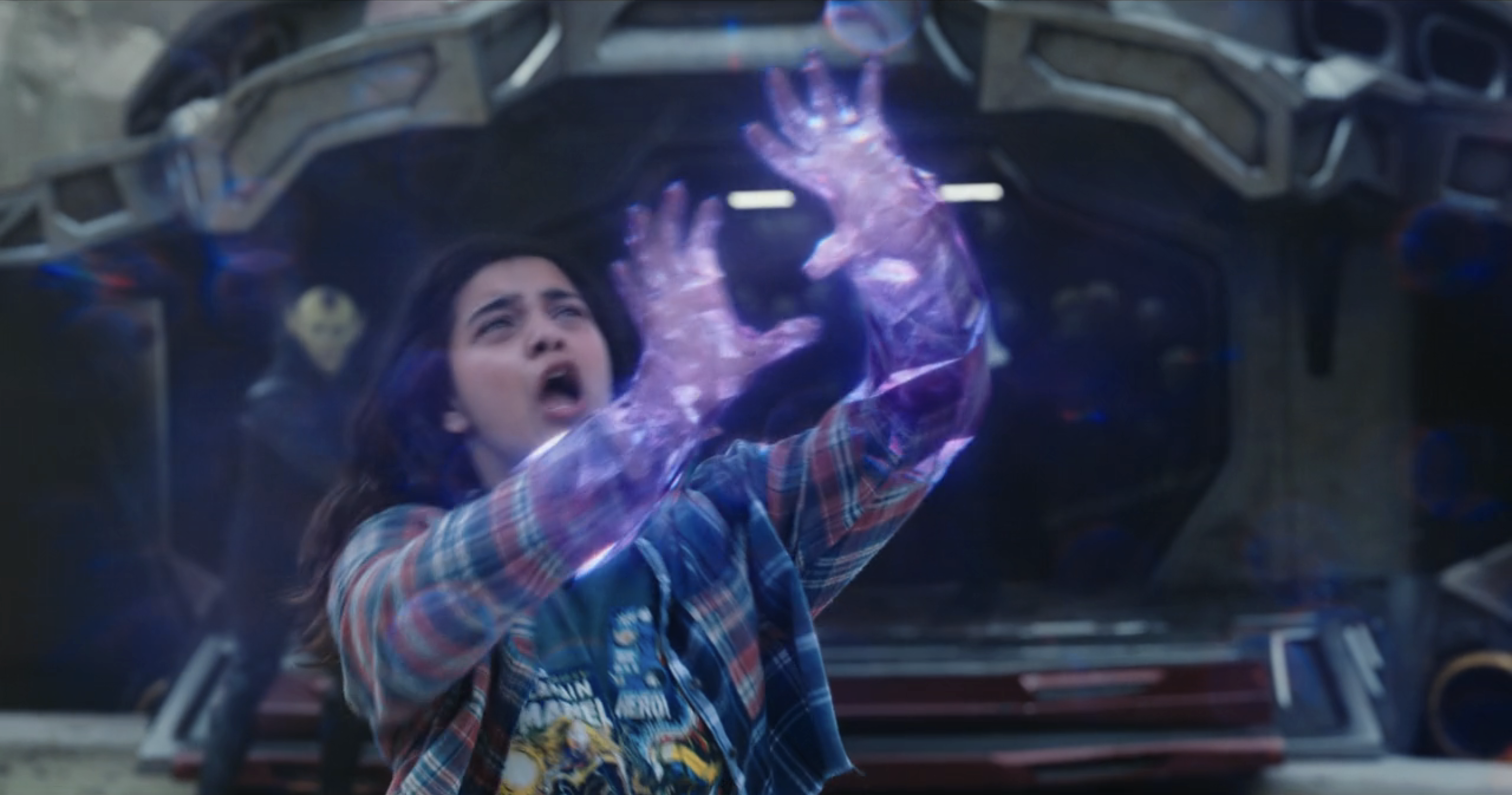 She continued to do this while also using her powers to jump to great heights and punch through walls at the enemies. Suddenly, she accidentally switched with Captain Marvel and found herself with Rambeau on the wing of a ship, fighting Dar-Benn. Since the two Quantum Bands were so close, Khan's started glowing, which Dar-Benn noticed, seeing that Khan had the other band. She demanded to know where Khan got it, to which Khan replied she received it in the mail from Sana Ali.