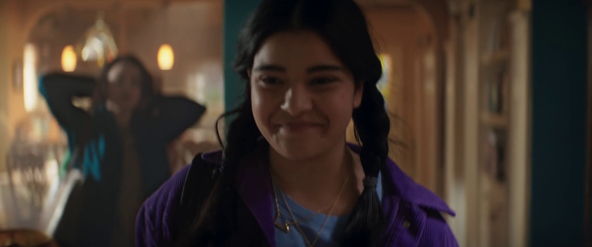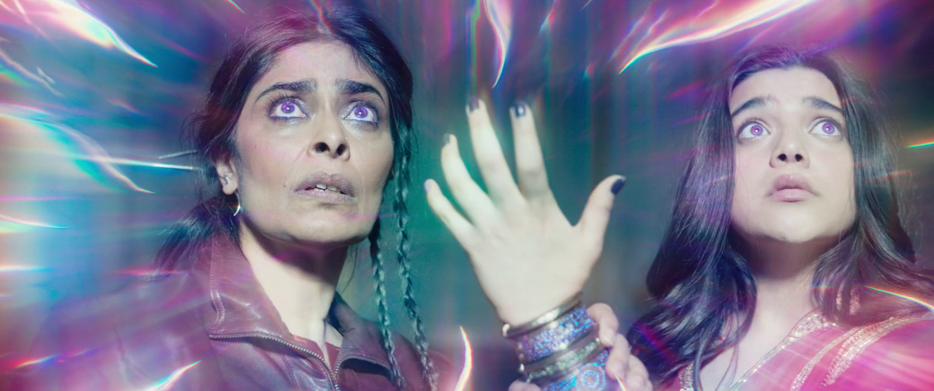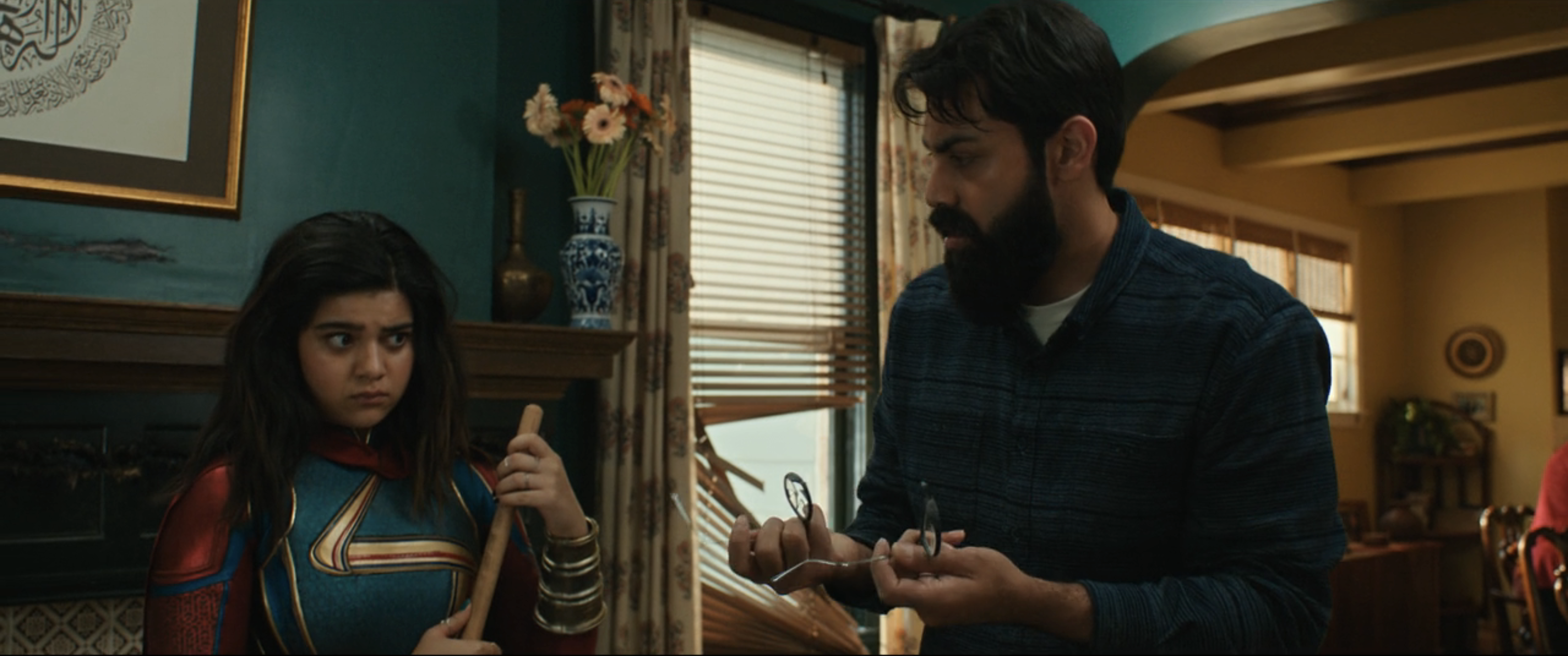 Still unsure of what was happening, Kamala took a broom and quietly sweeped up the house while the rest of the family cleaned up. Muneeba Khan gave Kamala a look of disappointment. Kamala then looked up at the hole in the ceiling before seeing the family standing in front of her. Suddenly, there was a ring at the doorbell, annoying Yusuf Khan. Yusuf opened it to find Nick Fury and Monica Rambeau. Kamala rushed to the couch to get a better look.