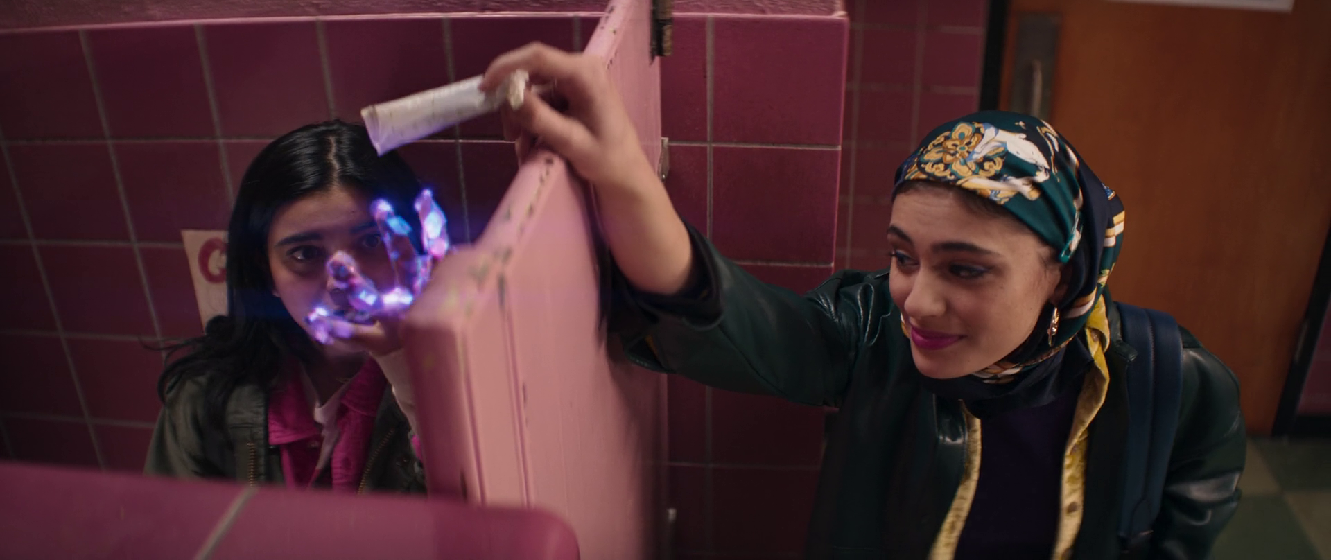 While Khan and Carrelli were walking around the convention, she got caught up looking at a Captain Marvel statue and Carrelli reminded her that the Captain Marvel cosplay competition was starting soon. They then noticed Zoe Zimmer entering the competition, greatly annoying Khan and Carrelli as Zimmer's costume was not accurate and she was not a fan of the Avengers. Khan went to the restroom to change into her costume. She was about to put on her helmet and the photon gloves that Carrelli made for her when she picked up her grandmother's bangle and prepared to put it on, but it did not fit. Khan heard over the announcement system that the Captain Marvel cosplay competition was starting, so she rushed out of the restroom, but accidentally left behind her gloves.