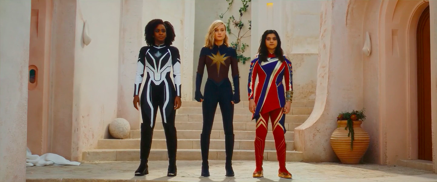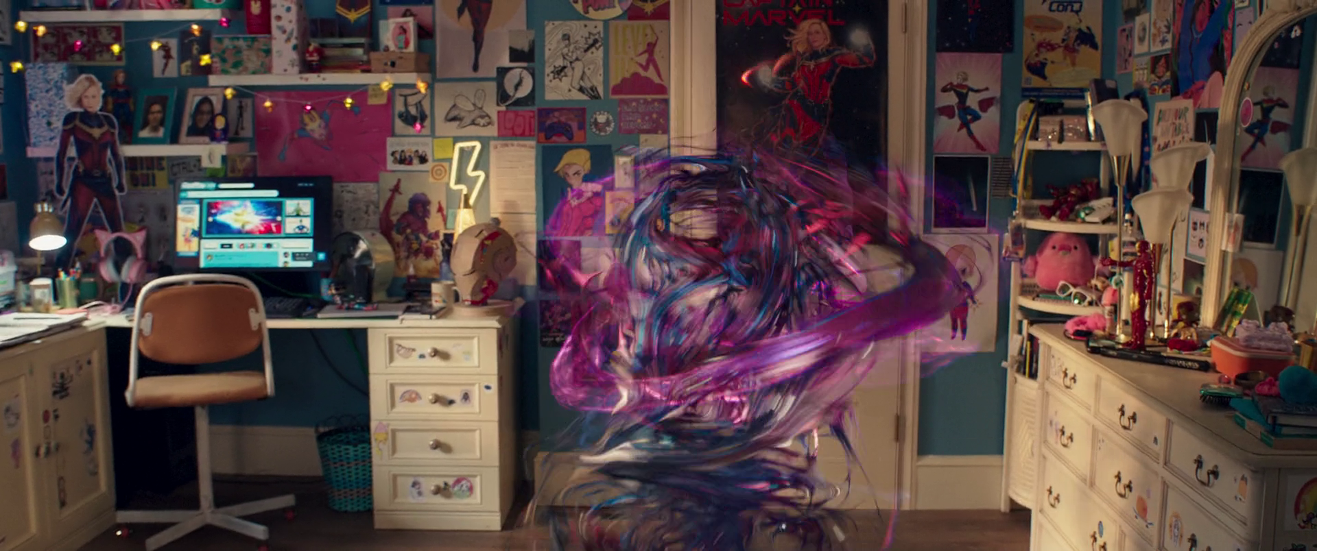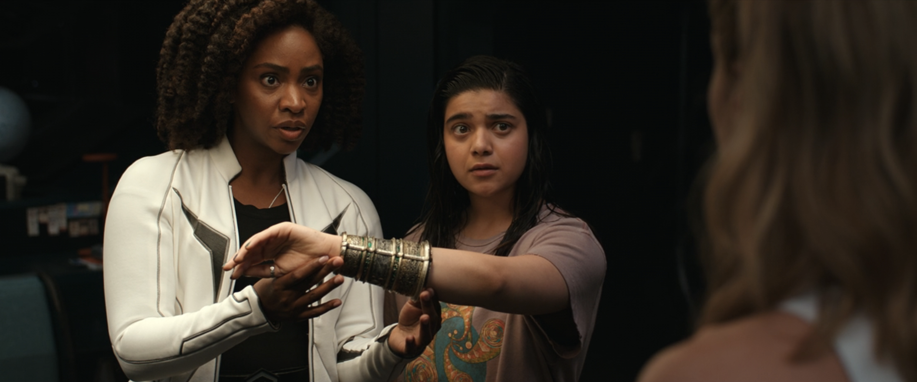 Khan got ahead of herself, trying to create codenames for Rambeau like Professor Marvel. However, Rambeau shot this down, so Khan moved onto to a team name: The Marvels. Khan then explained how she believed Dar-Benn was creating Jump Points through the bangles. Danvers remarked how they were called Quantum Bands. Khan noted that she knew there were two bands but did not expect the other one to be in space. Danvers expressed confusion on how Khan got the quantum band in the first place. Rambeau too got confused on how Dar-Benn and Khan just randomly bumped into each other, but Khan stated what was inscribed on her band: "what you seek is seeking you."