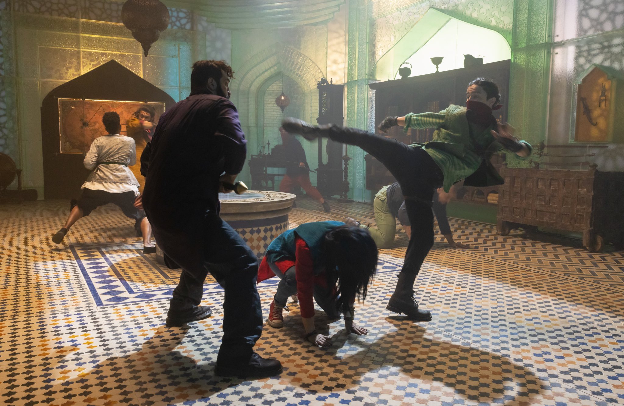 Inside the kitchen, Khan continued to hide from the Clandestines, but Najma shut off the lights and started pleading with her. Najma hit a pan which caused Khan to accidently create a "hard light" energy construct shield, revealing her hiding spot. She was then hit through a wall into the dining room by Aadam's mace where she continued to fight the Clandestines. Before Saleem was able to hit Khan, Carrelli attempted to help her by throwing a present at Saleem. However, he was injured by Saleem who then got punched by one of Khan's "hard light" energy construct fists. She used another "hard light" energy construct fist to punch the rest of the Clandestines and attempted to help Carrelli while Kamran distracted Saleem.