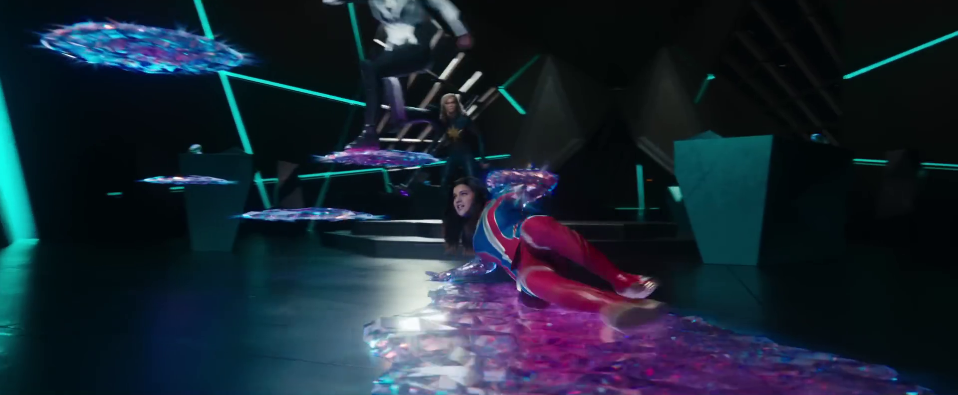 Khan then ran away back to the Hoopty, only to switch with Danvers again. Khan got back to the ship as Dar-Benn successfully started siphoning water to Hala. Rambeau struggled to fly the Hoopty out of harms way until Danvers returned to take control, prompting Khan to make a reference to Dead Poets Society. Danvers' emotions then got the best of her as she flew the Marvels into danger. However, Khan made a call and teleported them away.[4]