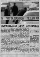 In 1988, the New Orleans Gazette published an article called "Two College Students Murdered," about the brutal murder of two college students which was at first suspected to be an act of hazing gone wrong. The article also commented on a similar murder from months prior which was poorly handled by the police and mentioned that the earlier case remained unsolved, as well as that the killer in this new case had not been caught. They reported on the New Orleans Police Department's response to the increased criticism, and safety measures colleges were taking as a result of the situation.[1] Louise Hastings found the news story while collecting information about the killer, Marduk Kurios.[2]