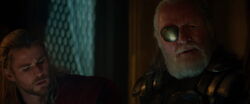 As a group of rag-tag invaders called the Marauders started to attack several of the Nine Realms, at the same time, Frigga discovered that Loki was alive and that he intended to conquer Earth.[6] Odin sent Thor to retrieve Loki using his dark Magic, at the cost of his own and Thor's health. However, there was an amount of time for Thor to get back onto Asgard with Loki. Odin watched Thor's confrontation with Loki through the eyes of Hugin and Munin.[7][1]