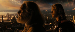 With the threat of the Frost Giants now at an end, Asgard then had a mighty feast, to celebrate the end of the war and the return of Thor. Odin, however, did not attend, instead he looked out into the nine realms, mourning his lost son. Thor joined his father and told him that he now understood why he had been banished and knew he still had much to learn. Odin told Thor that he had already made him very proud and he would make a fine leader someday.[1]