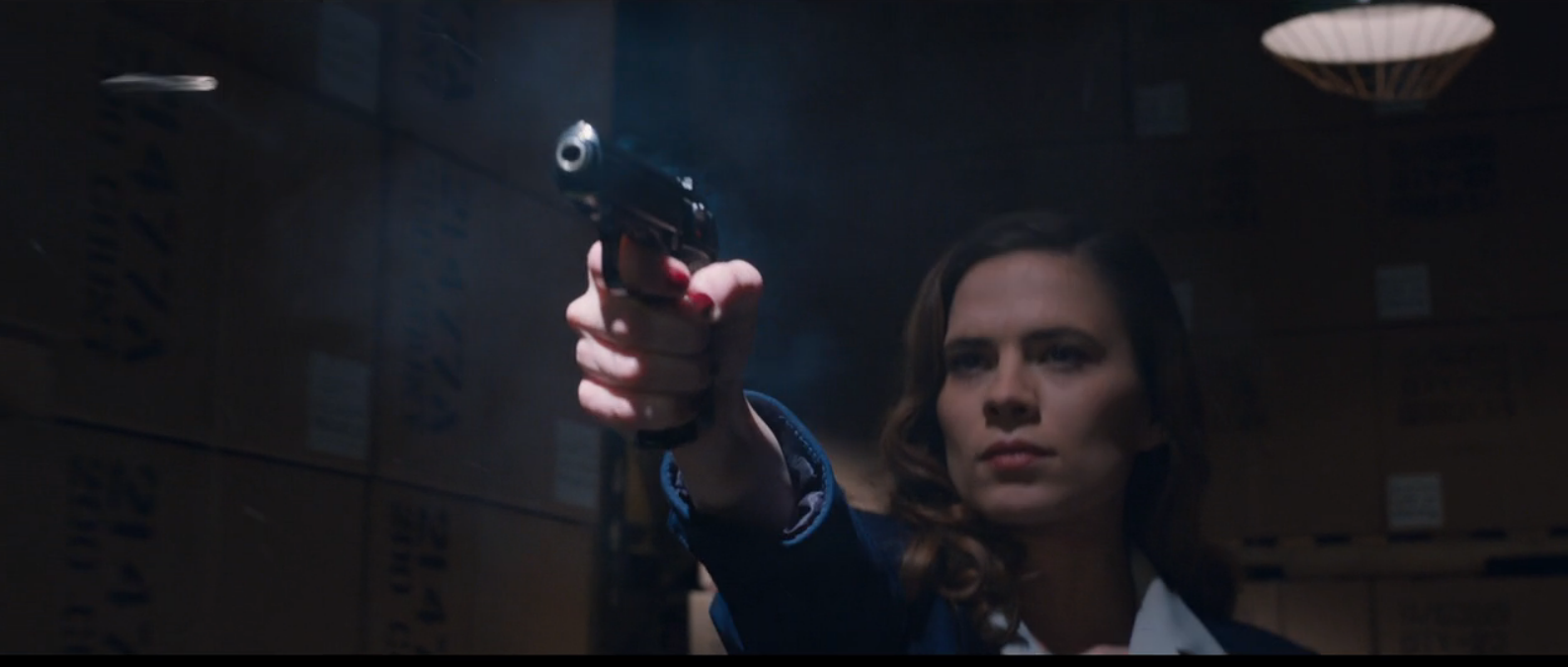 When Carter came to collect Rogers later, she found him trying out the new shield that Stark had created for him, having taken an instant liking to it. He then enthusiastically showed off his new weapon to Carter, asking for her opinion. Without any warning, Carter acted on her earlier jealousy and picked up a gun and shot at Rogers, forcing him to block the bullets with his shield. Carter stoically declared that the shield indeed works before walking off, leaving Rogers and Stark shocked and impressed with her ruthlessness.