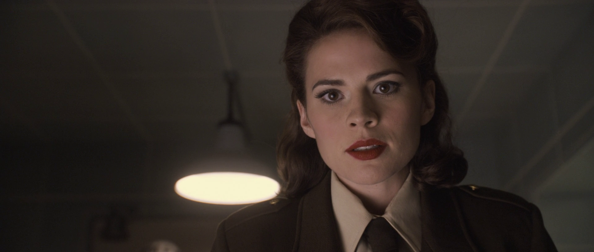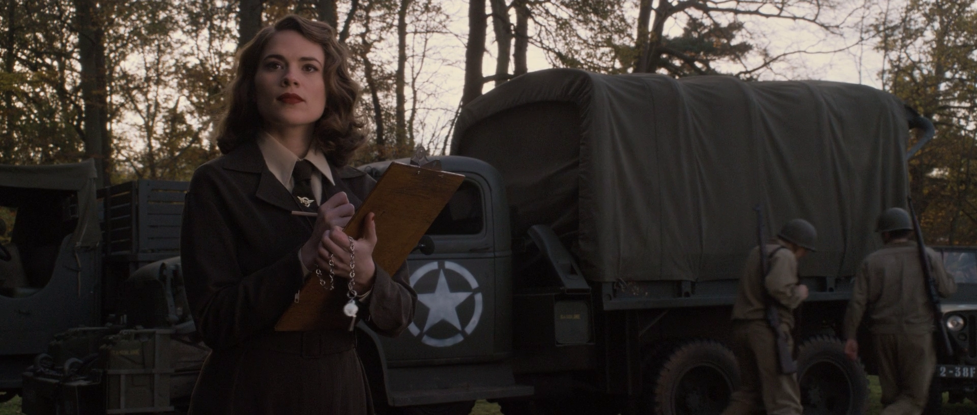 Running across the camp with Rogers, Carter then went immediately confront Colonel Phillips tent who teased Rogers over his Captain America character. As Rogers begged Phillips to inform him if Barnes was alive or dead, with Phillips explaining they believed he was gone, Carter looked upon Rogers as he began to plan on leaving the base camp and left the tent. Carter then stole weapons and some equipment, including Captain America's Shield, in an attempt to drive to the Hydra base and find Barnes.