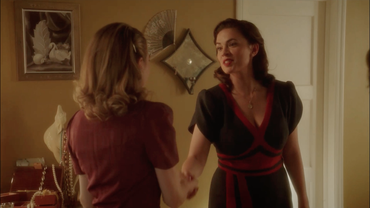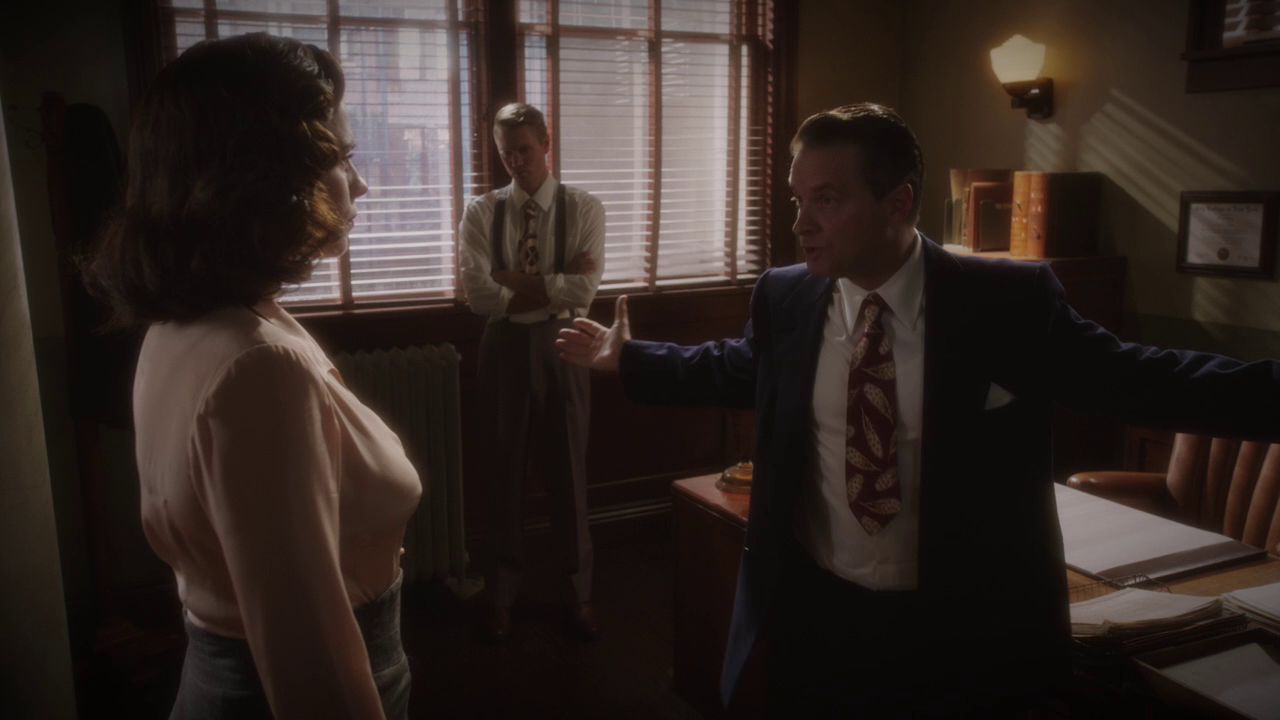 Carter and Edwin Jarvis prepared to investigate the vault where Howard Stark's weapons were stolen but, before they could begin, Agents Jack Thompson and Daniel Sousa knocked on the door which questioned Jarvis and took him in for further interrogation. When Jarvis was threatened with the concept of him and his wife Ana Jarvis being deported due to a treason that Jarvis had committed during World War II, Carter knew she had to free him. Carter took the police theft report of Stark's car and later told Roger Dooley that she mistakenly took the report in Jarvis' presence, thus freeing him from his interrogation. She was taken into Dooley's office and humiliated in front of the rest of the SSR agents for being a seemingly incompetent agent. Dooley ordered her to apologize to Thompson who claimed that a sorry did not begin to make up for what she had caused. Carter and the rest watched as Jarvis was freed, leaving Dooley furious.[21]