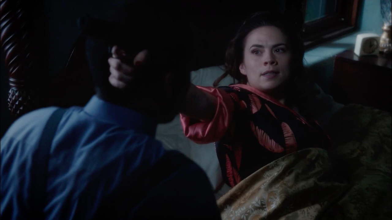 Carter and Edwin Jarvis sneaked Howard Stark back into the States through a train car by making a deal with two subordinates of smuggler Otto Mink; the deal went south when one of the men decided they should get paid more, forcing Carter to knock them out and free Stark. Carter attempted to take Stark to his penthouse, but it was being guarded by Yauch. Thinking of nowhere else to safely put him, Carter sneaked Stark into her apartment at the Griffith Hotel.