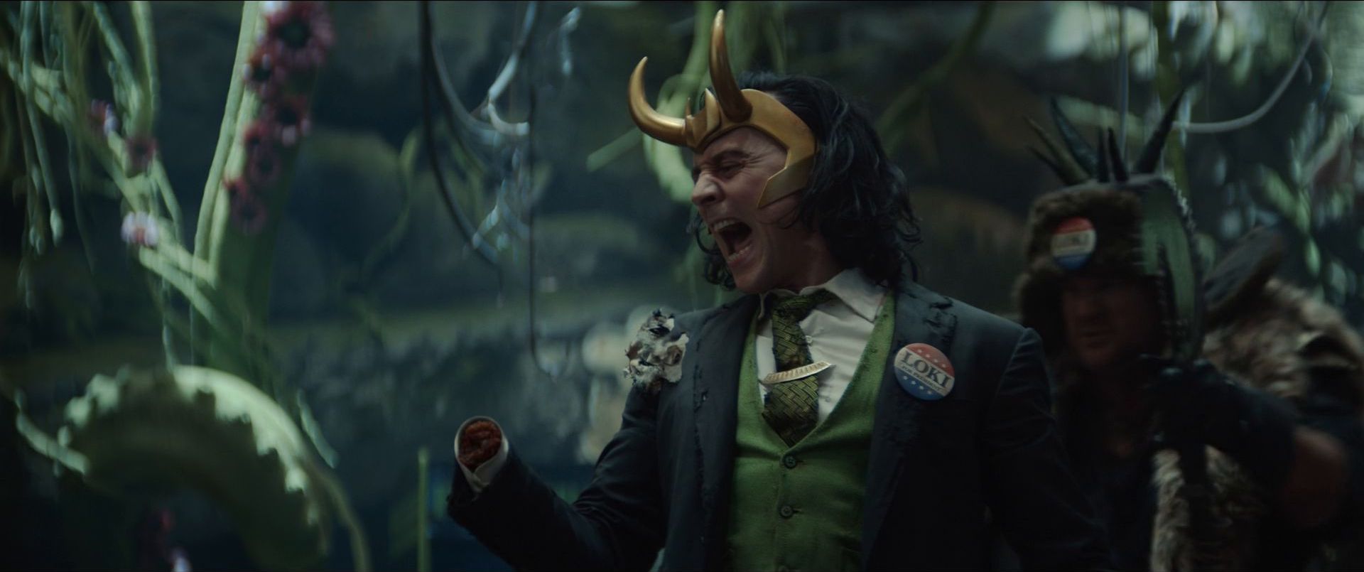 Having just officially betrayed his accomplice, President Loki enjoyed his victory and gloated that the Void belonged to him, as it was his army and his throne. President Loki was shocked once his own Loki Variants turned on him, infuriating him. Alligator Loki attacked him and bit off his right hand, prompting a high-pitched scream from the Loki Variant. A battle erupted between the Loki Variants for supremacy with one Variant slamming President Loki headfirst into a popcorn machine at one point. Classic Loki used his magic to create a distraction for him and his companions to escape by sending projections of them into battle.[1]