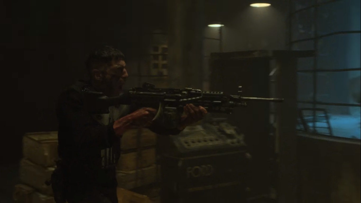 Punisher hid this machine gun in a box of packing peanuts, in preparation to face Billy Russo's Anvil soldiers' ambush on Micro's hideout. After he received heavy fire to his vest and was forced to discard his shotgun, he took cover behind bigger crates to detonate an explosive and draw out the rest of the soldiers. He began to fire upon his attackers, but quickly dropped it to instead kill a hidden soldier with his combat knife, and steal his gun instead.