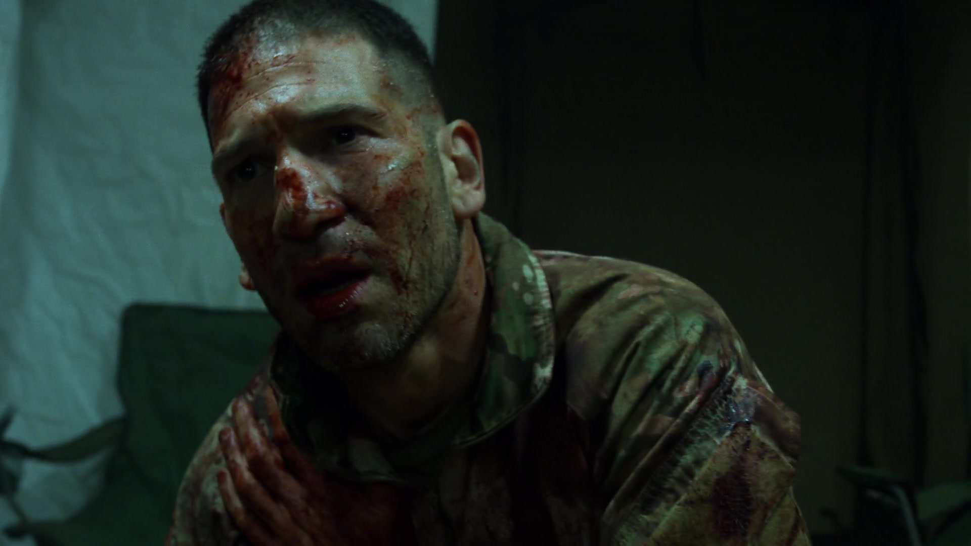 Finding himself in an open hallway surrounded by hostiles, Castle continued firing until he took a bullet to the shoulder which knocked him to the ground as he hid behind a pillar. However, Castle remained determined to not only save all his fellow soldiers, but to return home to his family, so he swallowed his pain and got back onto his feet. Drawing his knife, Castle waited for his opening and furiously battled the remaining four soldiers, beating and stabbing them to death until their blood covered his face. However, Castle had successfully cleared the whole area, killing all hostiles, and saved his squad.[11]