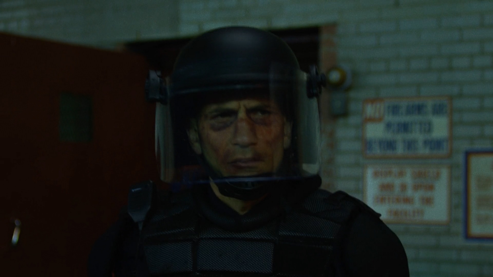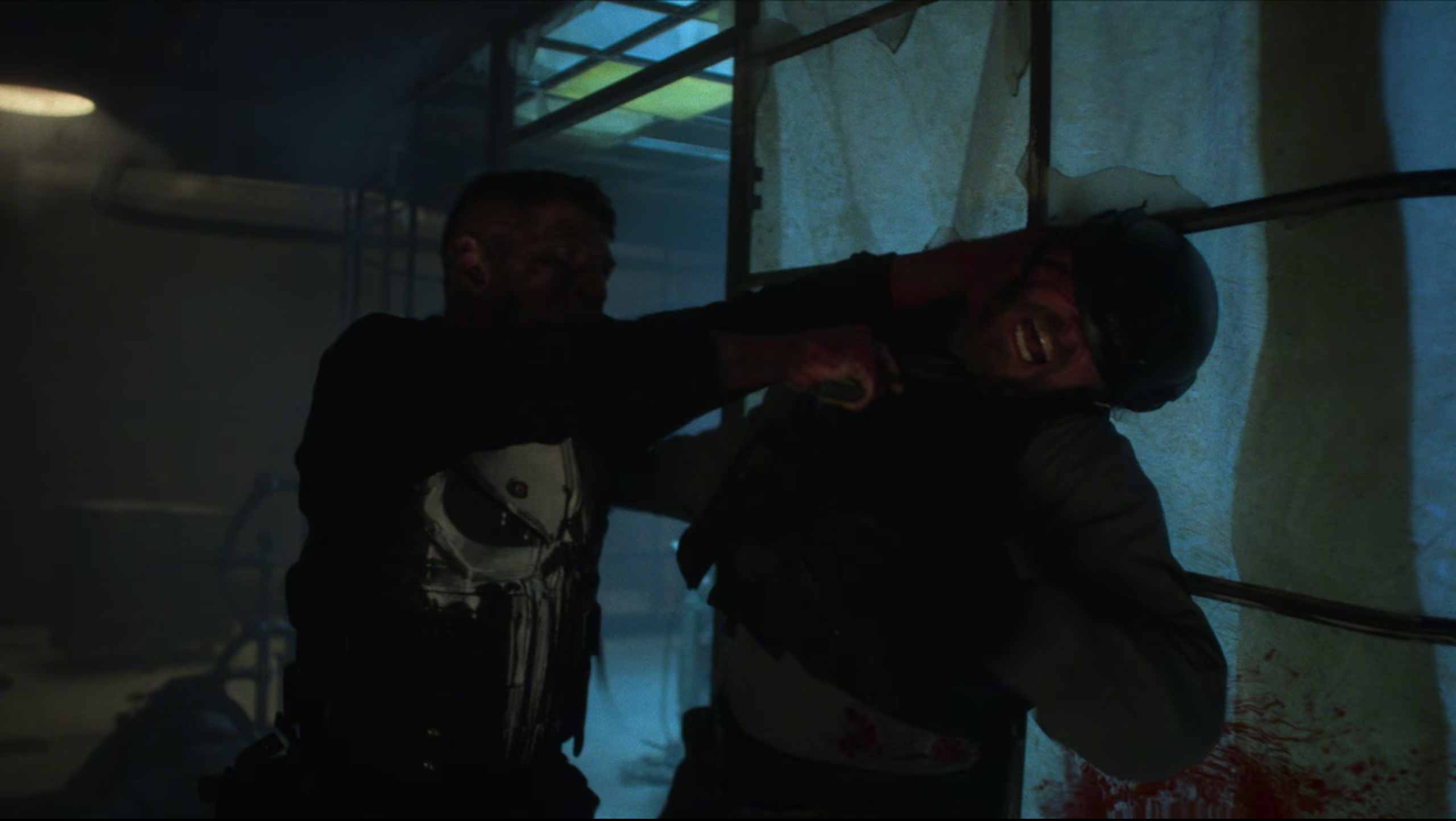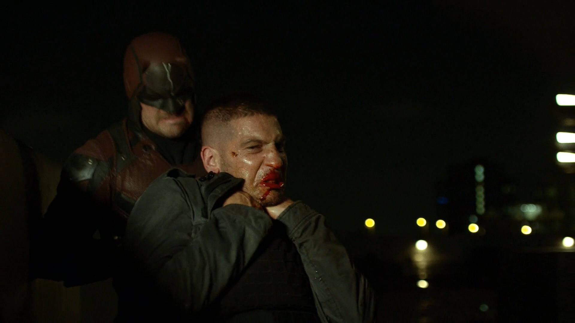 As Castle and Daredevil continued to fight, Samantha Reyes ordered the New York City Police Department to aim their largest lights at the roof to expose Castle and Daredevil while the SWAT teams began shooting at them. Castle and Daredevil continued fighting as they dodged the many bullets being fired at them. Eventually, they fell through a glass ceiling and Castle saw that Daredevil was suffering from great pain. Castle was able to take the wounded Daredevil hostage onto a rooftop for interrogation and a discussion about their differing methods of justice.[4]