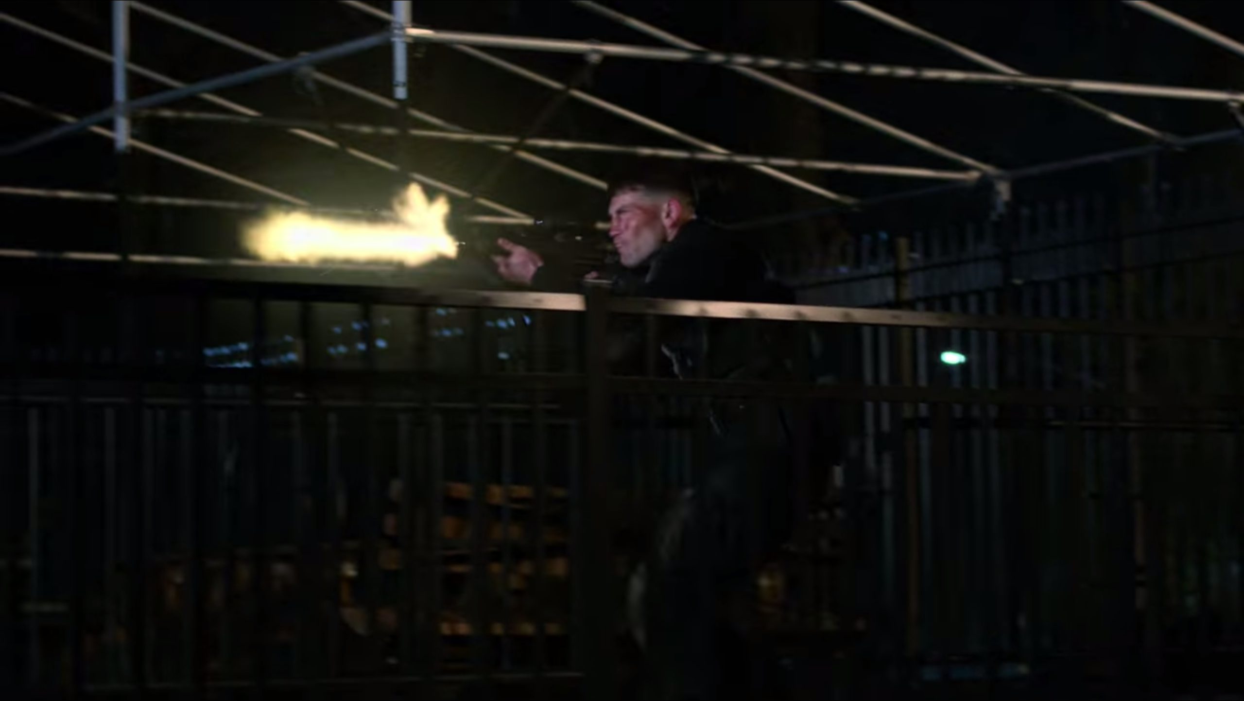 Castle strapped the last remaining member of the bikers to the driver's seat of the truck and made him drive to the meeting point. The police officers under Reyes' command mistook the gang member for Castle. They began shooting at the truck, killing the man, while they were still unaware of Castle's true location as he continued to watch the entire event unfolding just as he had planned. Castle meanwhile perched on a nearby rooftop and once again took aim at Grotto; however, once again, he was interrupted and attacked by Daredevil who attempted to ensure that Grotto was not harmed by the Punisher as the pair began to fight once again.