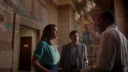 The next day, Strategic Scientific Reserve Chief Daniel Sousa and Agent Peggy Carter returned to Isodyne Energy Headquarters and saw the Receptionist; they had obtained a search warrant. She told them that an accident occurred and no one was allowed to enter; the agents found the situation convenient for Isodyne Energy, but not for them. Behind her, workers in hazmat suits were putting boards on the door. The Receptionist then watched as Carter spoke to Jason Wilkes, before the agents left the building.[2]