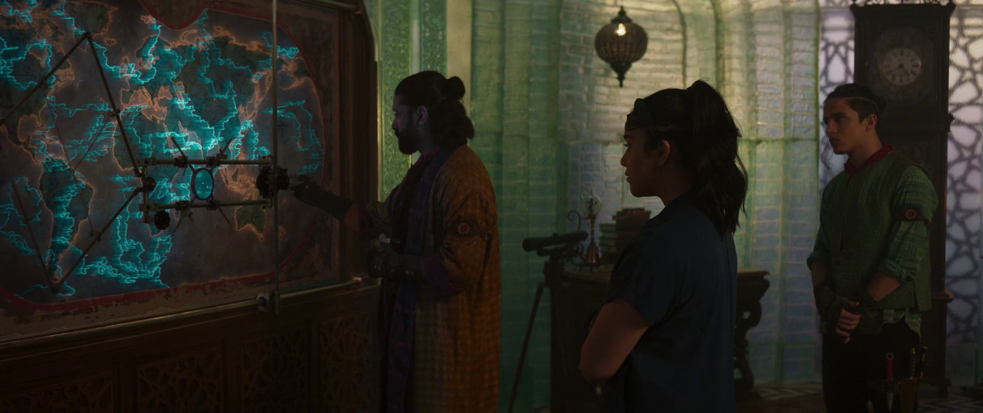 He then brought Khan to the Order of the Red Daggers' hideout and introduced her to Waleed. Waleed, recognizing her as a descendant of Aisha welcomed her to the Red Daggers. As they ate Chinese food, Khan asked why the food was red, in which Kareem retorted asking if Americans whitewashed that good as well. Khan then asked him if his scarf was big enough to cover his mouth, causing him to become annoyed. Waleed then began to explain the Noor Dimension to Khan, and Kareem, having knowledge of it as well, added to what Waleed said. Kareem then watched as Waleed looked at the inscription on the bangle, which both of them were unaware of.[1]