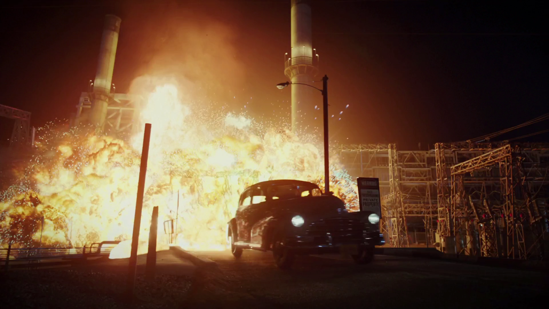 The Nitramene bomb finally detonated, with a blast that destroyed the whole refinery and an implosion that crushed the whole compound into a heavy ball of wreckage. Though they managed to escape, the car that Jarvis was driving was reached by the blast, and its bumper and license plate were fused with the rest of the material.