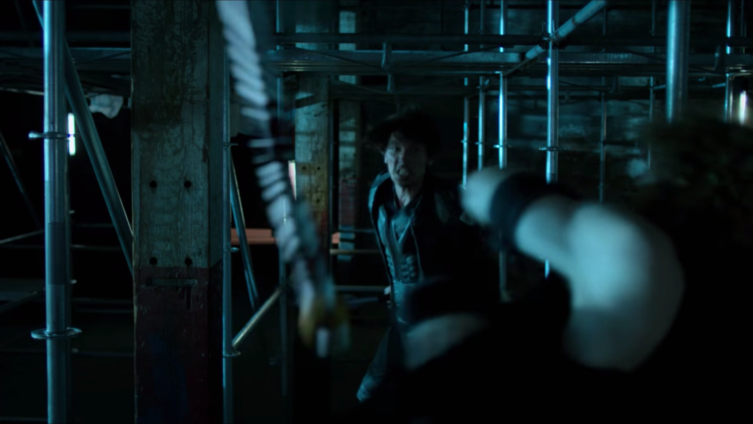 As Scythe told Iron Fist that he had a desire to serve the Hand until his death, he threw the broken Naginata at him, before grabbing his signature scythe weapon to continue their duel. Once Iron Fist then attempted to get away from Scythe and his new weapon, they made their way through the Warehouse, putting their fight in a much more claustrophobic environment, as Iron Fist was able to use the amount of scaffolding around them to his advantage as Scythe struggled to use his weapon within this environment, as it continued to get stuck between the steel pipes, despite all of Scythe's best efforts.