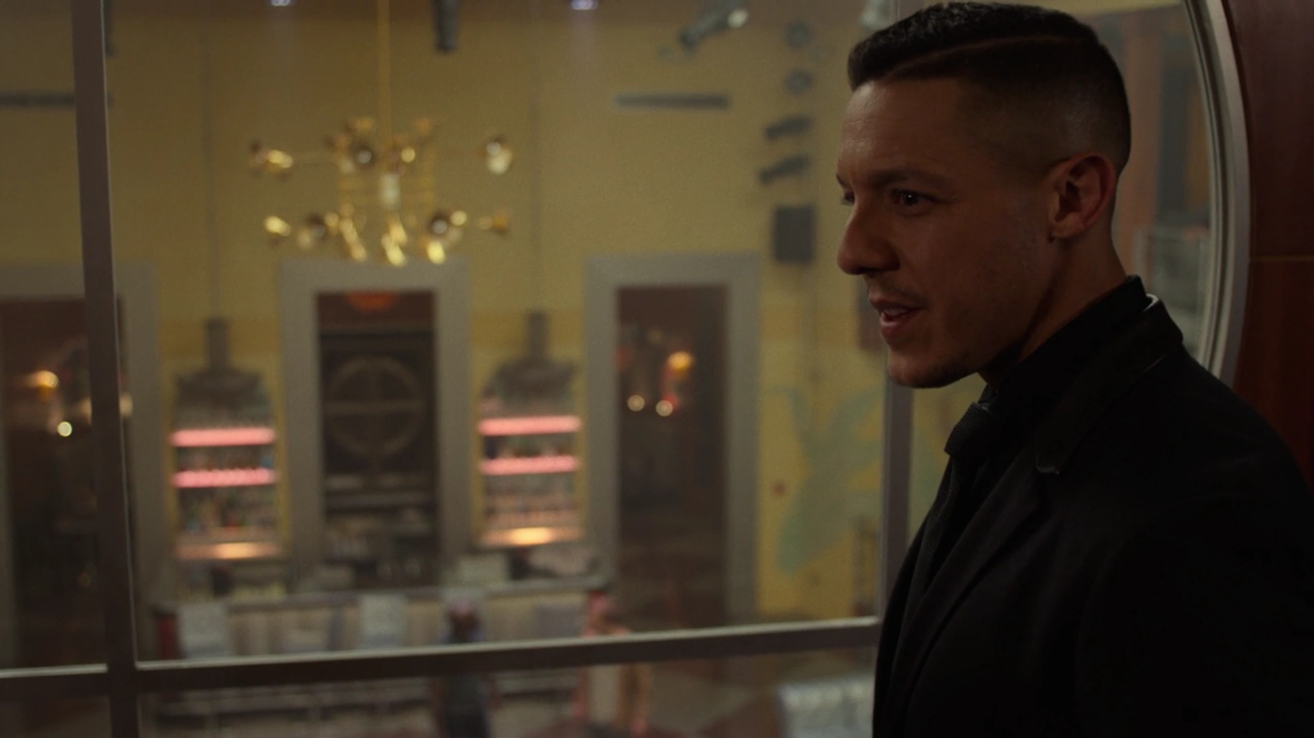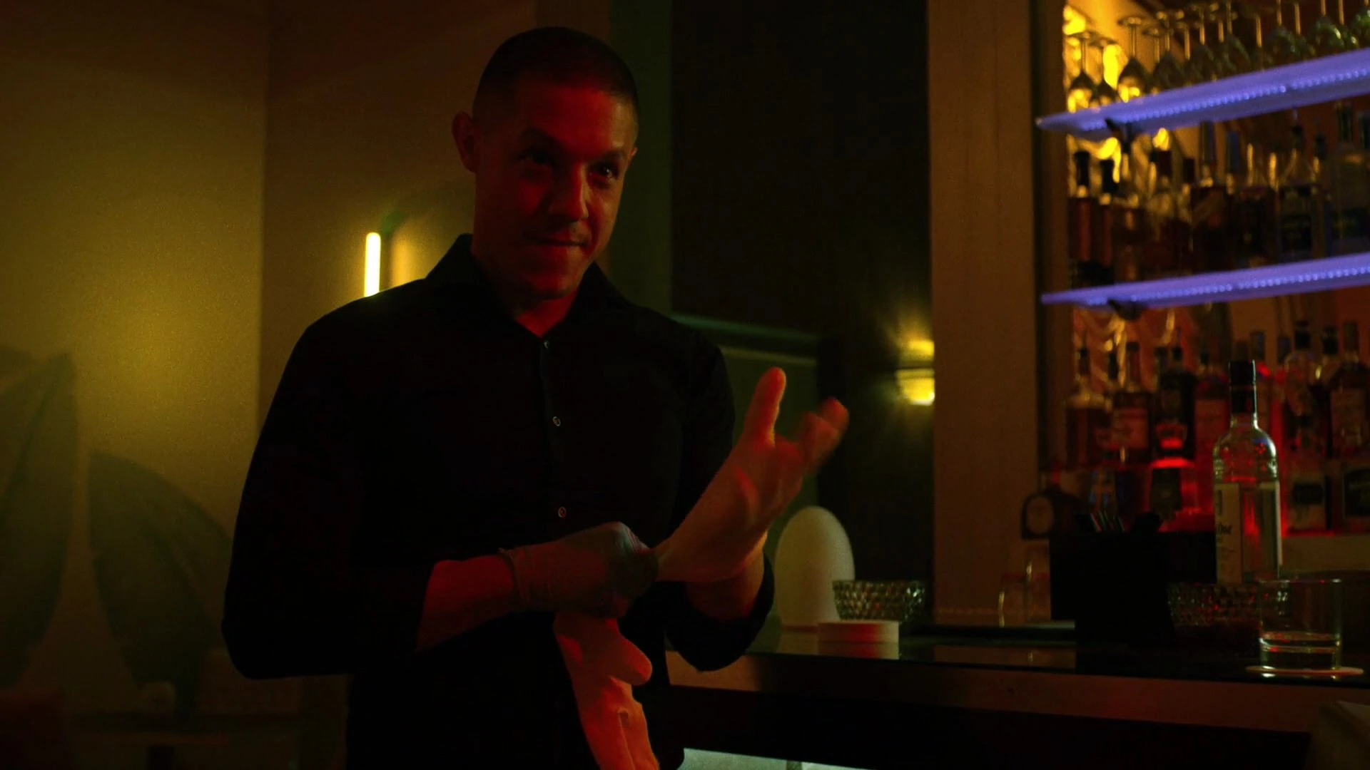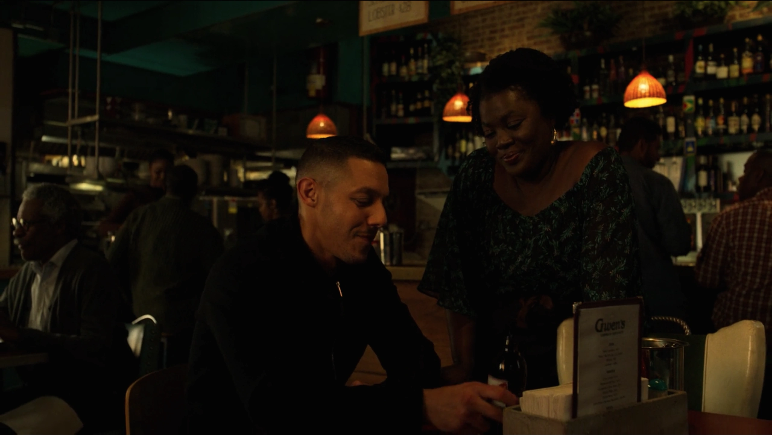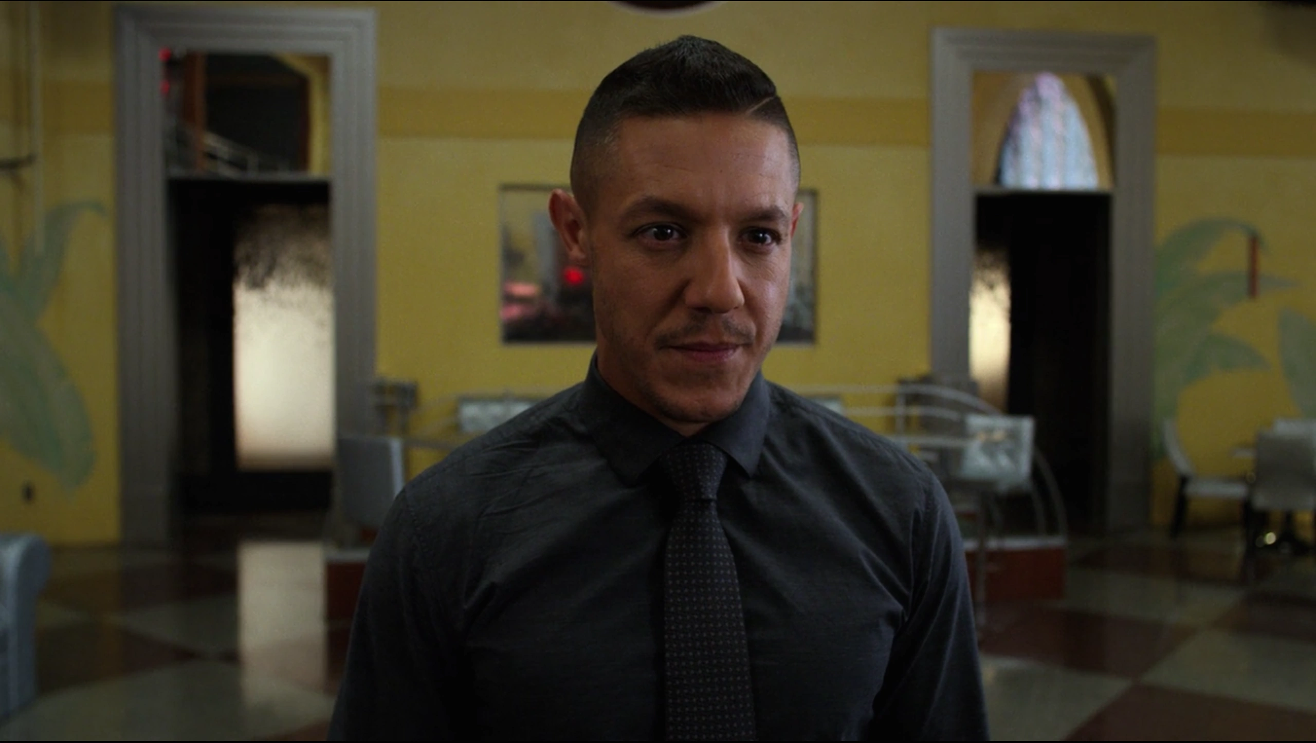 It did not take long for Shades and Tone to track down Shameek Smith, who they brought to Cottonmouth under the concept that Domingo Colon's people were looking for him since the heist and Cottonmouth wished to protect him, which was a lie as he simply wished to interrogate the man who had stolen his money from him in order to find the rest and repay Mariah Dillard. As Shades walked through the kitchen, he passed by a dishwasher called Luke Cage, who watched him closely as he walked by with Smith, although Shades paid the man almost no attention what-so-ever as he continued walking.