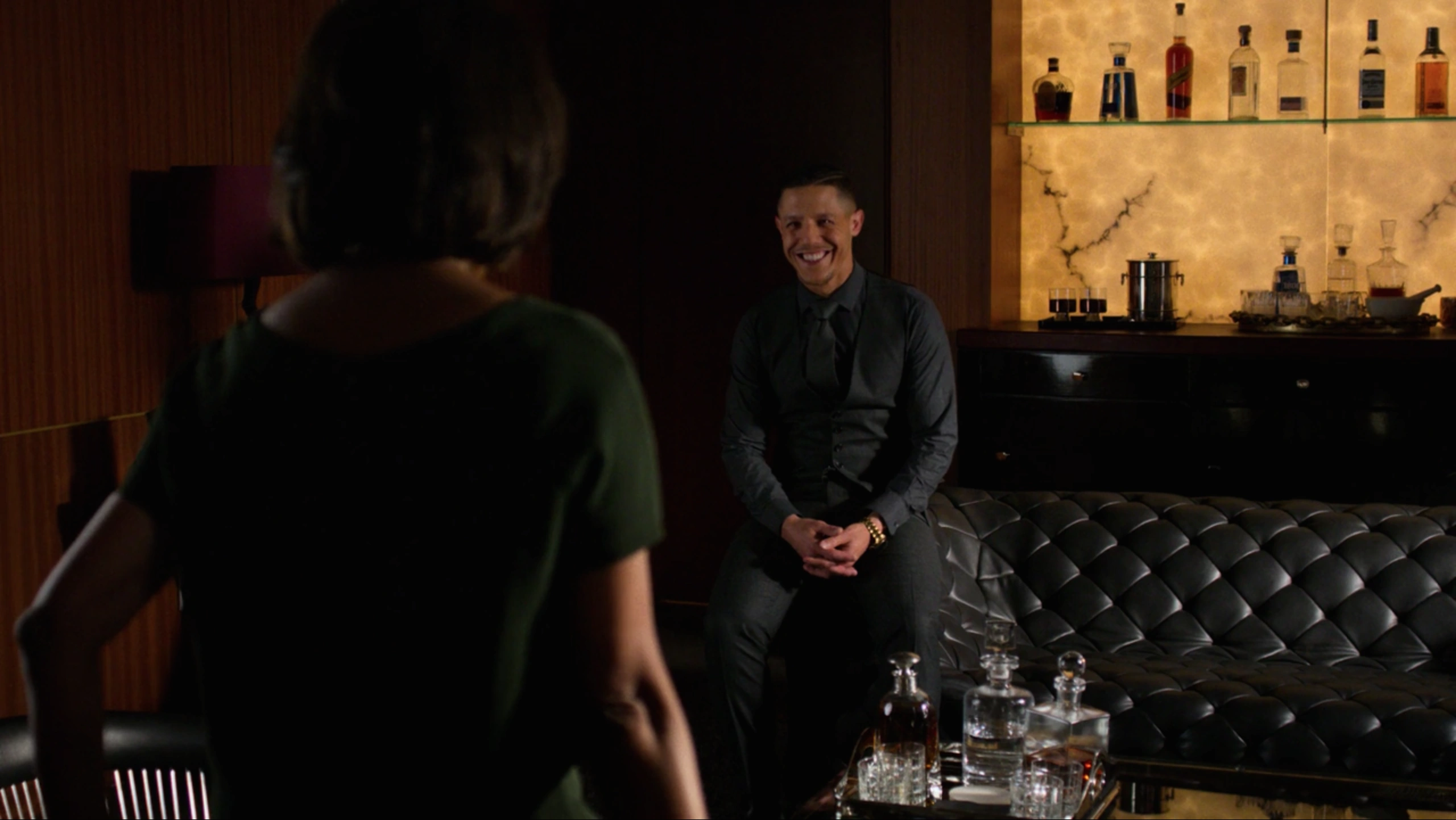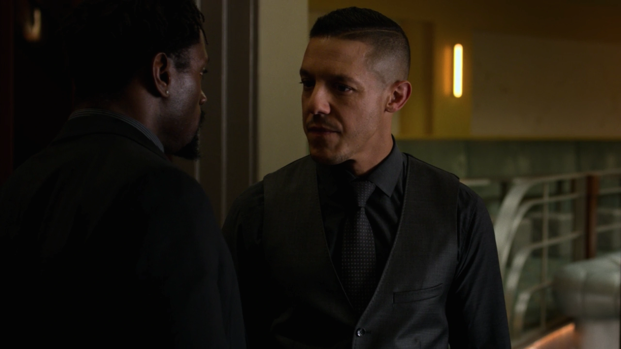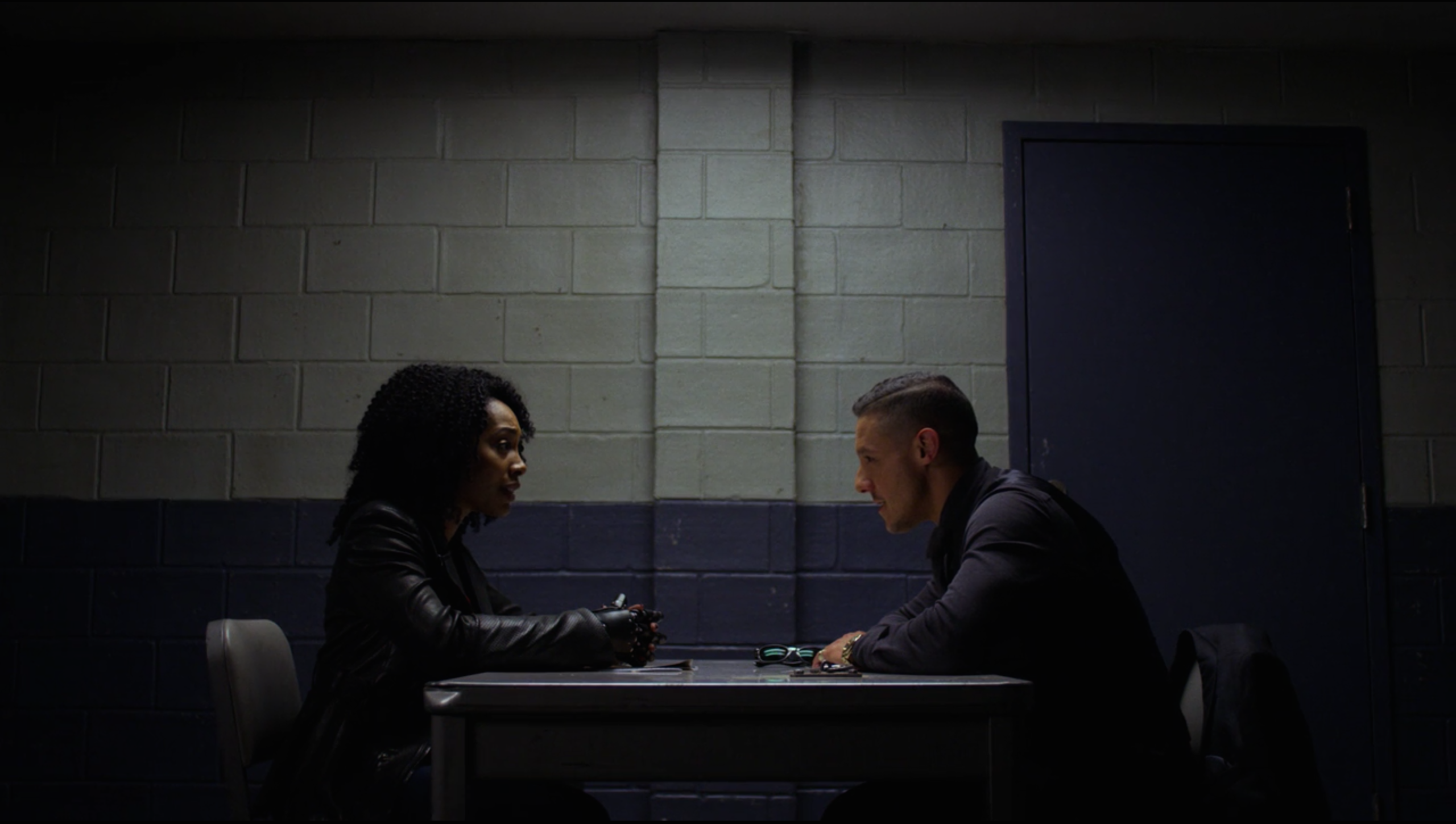 Before long, Shades was interrogated by Ridley, who threatened to send Shades to Rikers Island if he did not cooperate with her, but Shades only ignored her and calmly requested a lawyer. Ridley noted she knew Shades' history with meeting Cottonmouth while a young man before being sent to Seagate Prison before he explained that somebody had already bailed him out, but Shades still requested a lawyer again. When Ridley even threatened to send Shades back to Seagate for twenty years, Shades mockingly asked for a lawyer while laughing in her face while she then walked out of the room.
