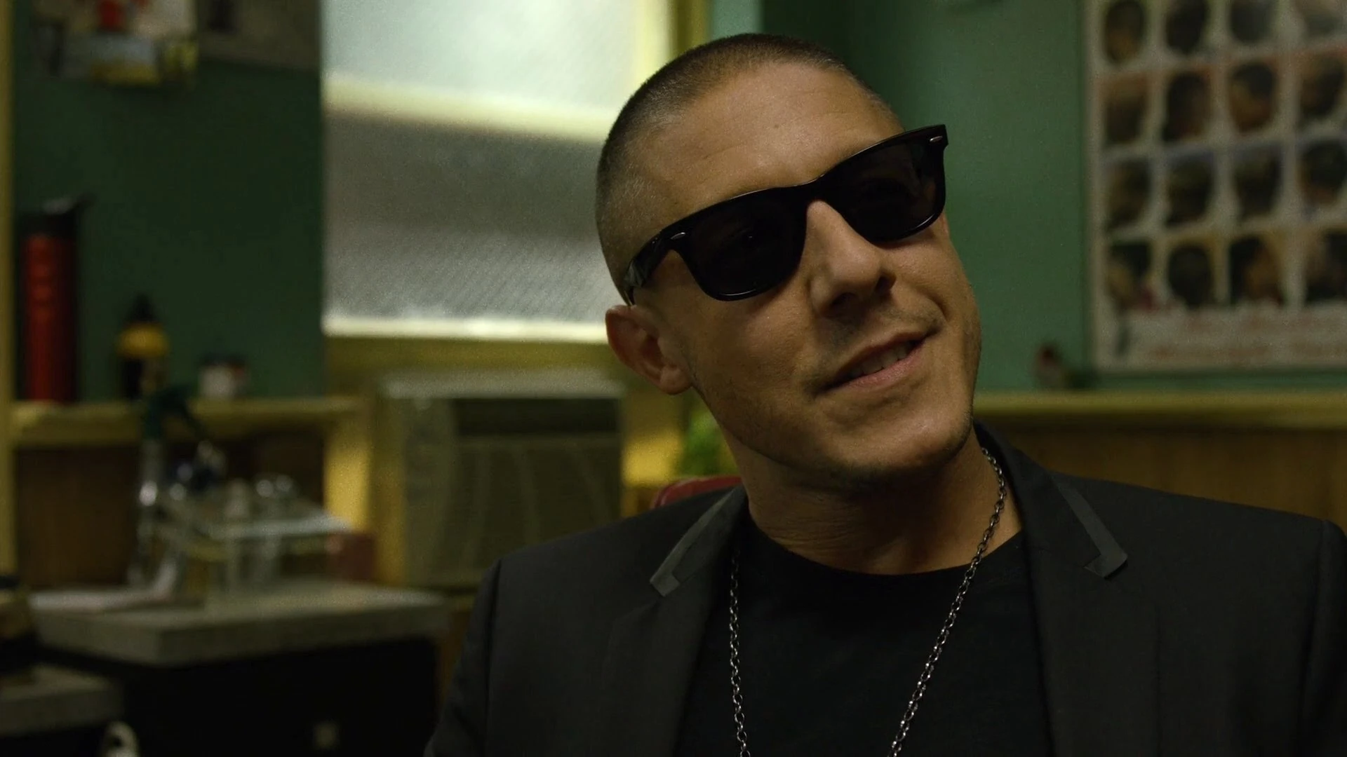 Luke Cage accidentally broke his broom and Shades noted that it was clearly very cheap while Cage claimed it was just old. Shades then went on to explain that he had just left Seagate Prison and was looking for Diaz, claiming that he used to cut his hair for him, and he wanted to reconnect now that he was back, but Cage told him that Diaz seemed to have gone and would not be returning. Shades joined Cottonmouth as he left, while Cage ordered him to pay for his shave as was Pop's policy, much to Shades' amusement as he left with Cottonmouth while Tone paid the bill.[12]