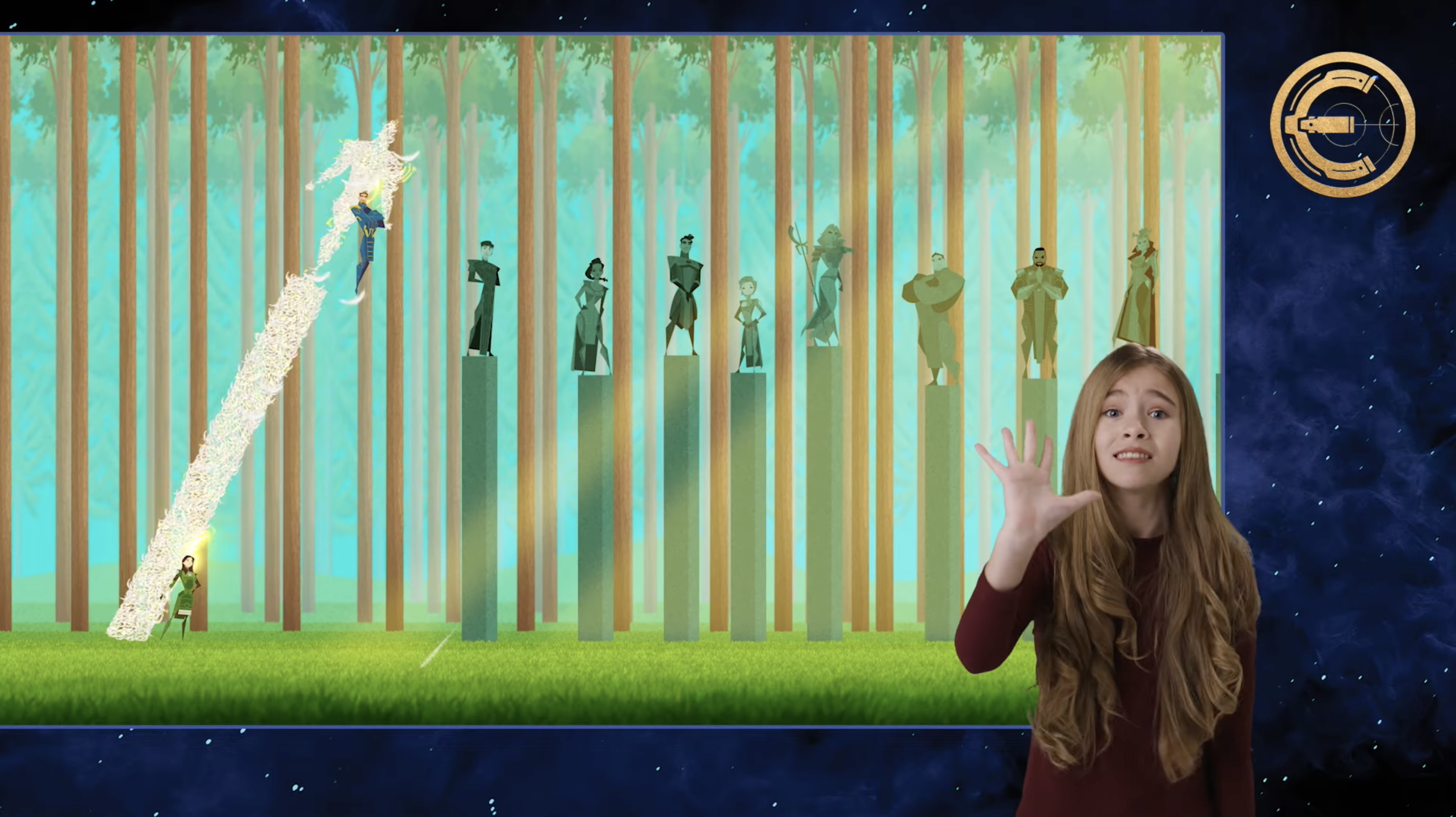 Sersi and Ikaris decided to play a game of speed, briefly taunting each other before Ikaris counted down to start the game. The pair ran through a forest, and Sersi instantly transformed trees into statues of their friends. One of the statues toppled over, causing the others to fall. Ikaris saw this and used his powers to stand them back up before they could completely fall. Sersi turned a large redwood tree into a statue of Ikaris, which fell and nearly crushed Ikaris. However, Sersi stopped the statue from falling by turning it into a bunch of feathers.[3]