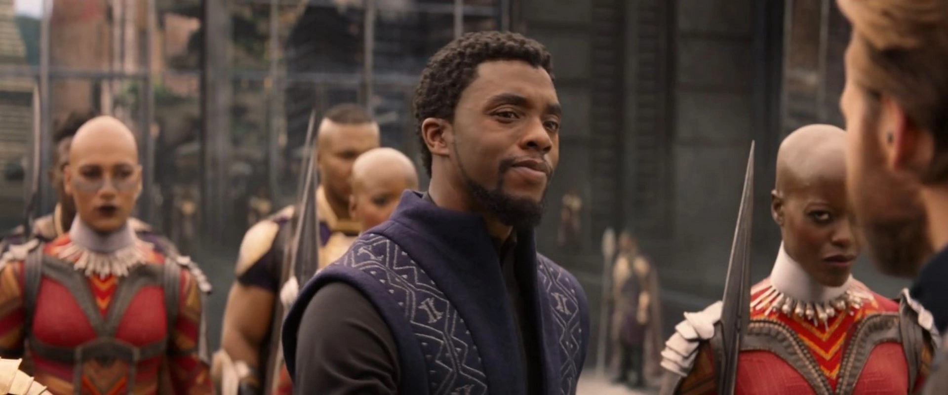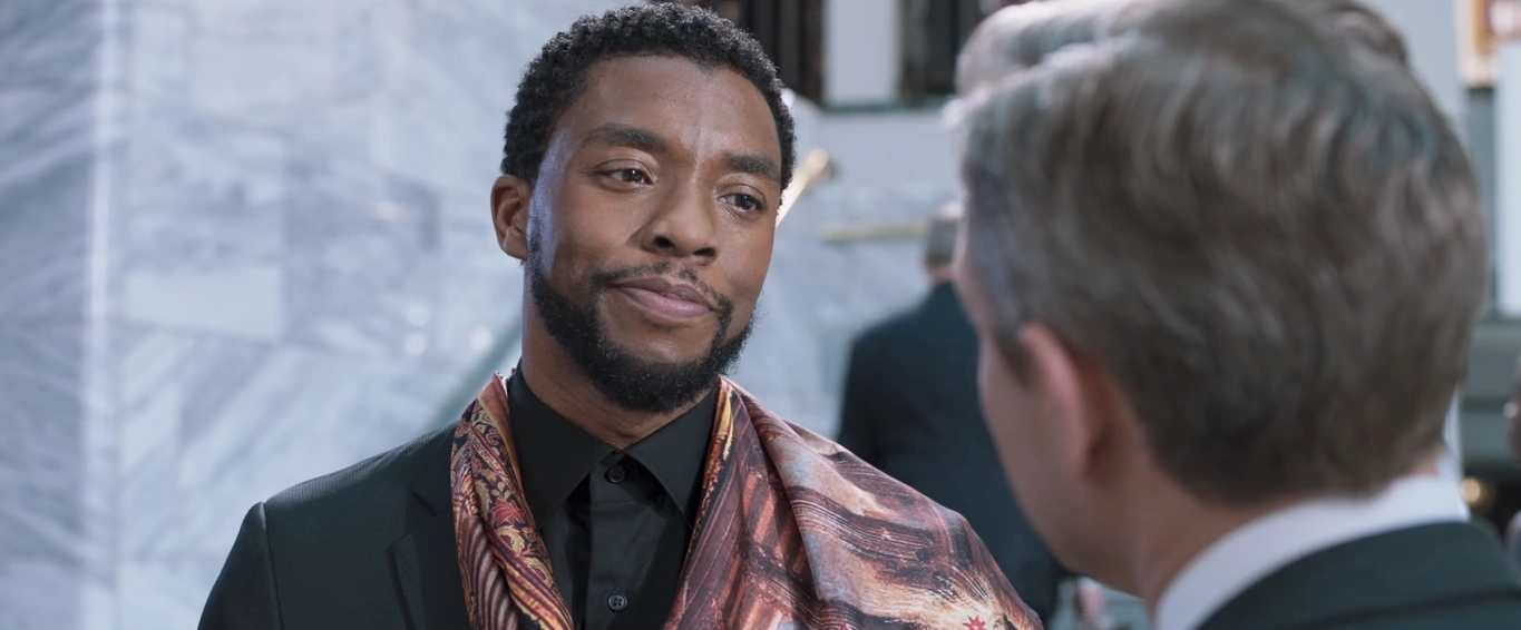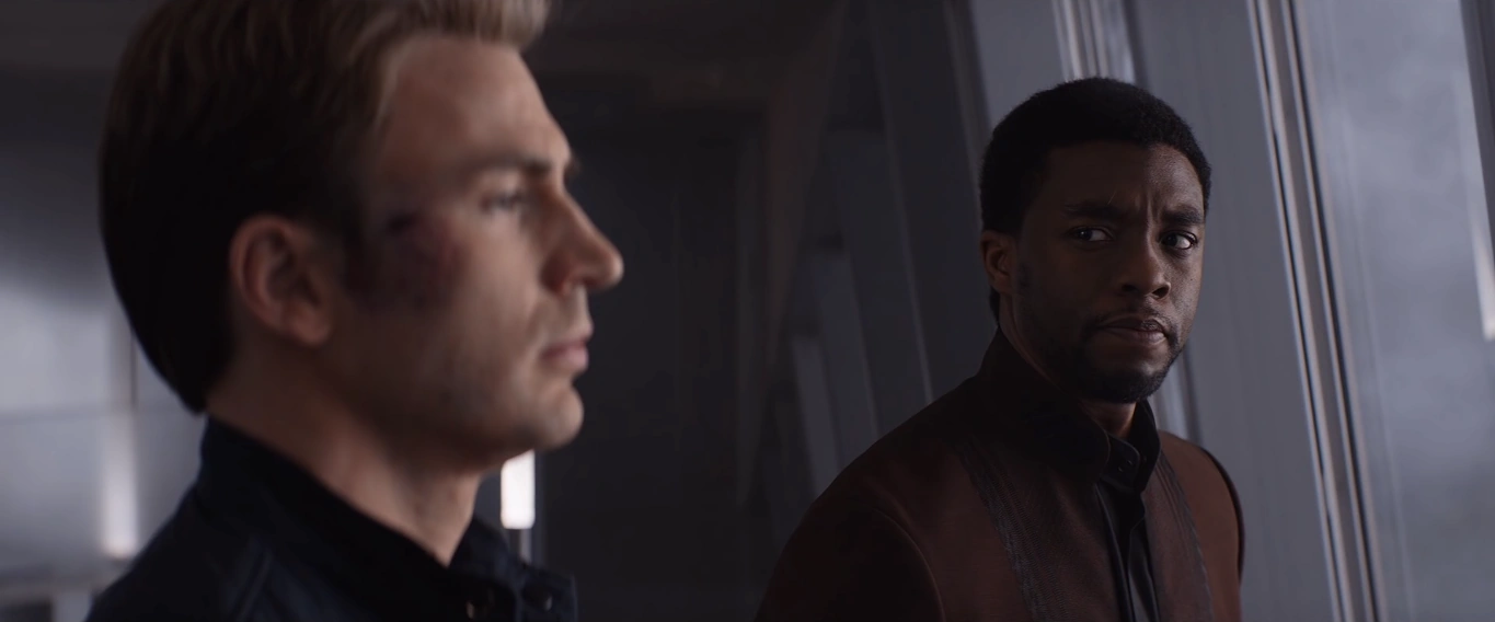 Shortly after T'Challa recruited Bucky Barnes, he waited for the Avengers' arrival in their Quinjet. Walking toward the helipad, T'Challa was asked by Okoye that while opening to the rest the world she did not expect a war incoming, to which he responded with a question with what she had in mind, talking about the Olympics and Starbucks.