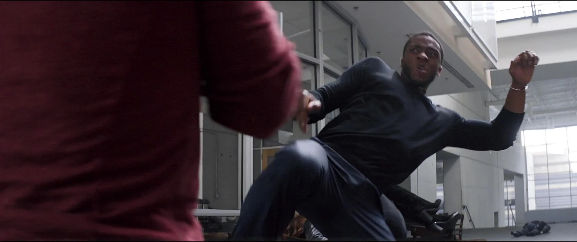 However, the exchange was then unexpectedly interrupted by the position of Okoye, resulting in T'Challa furiously throwing one of Klaue's bodyguards away to save Ross' back from the shootout. Seeing this, T'Challa then apprehended one of Klaue's henchmen and fought against multiple of them in the middle of the room. T'Challa looked over the balcony to see Klaue getting away from the scene, then he leaped over the top and yelled at him for being a murderer.