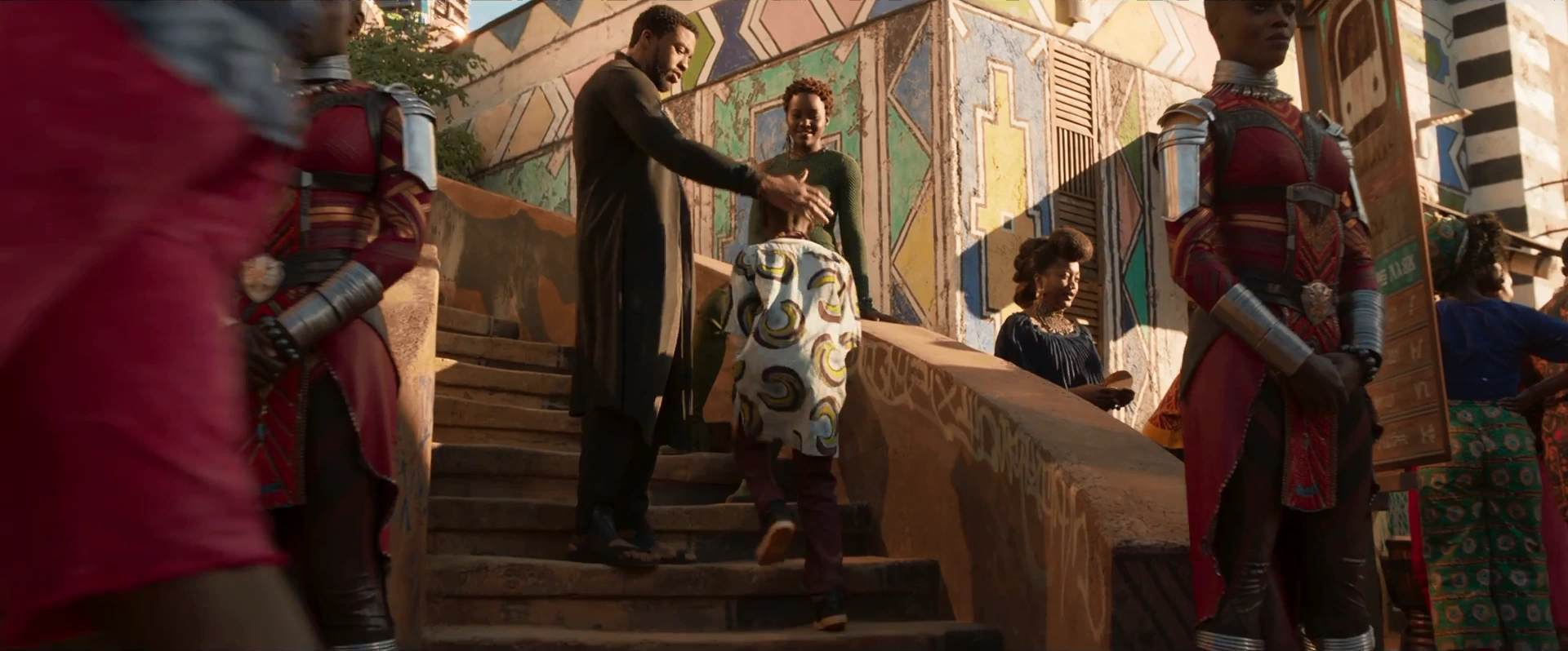 Having finished his coronation for today, T'Challa took the time to walk with Nakia on the streets of Birnin Zana, wanting to have her stay there; however, she decided not to as she wanted to support his father and that she isn't happy to abandon any other people that have nothing.