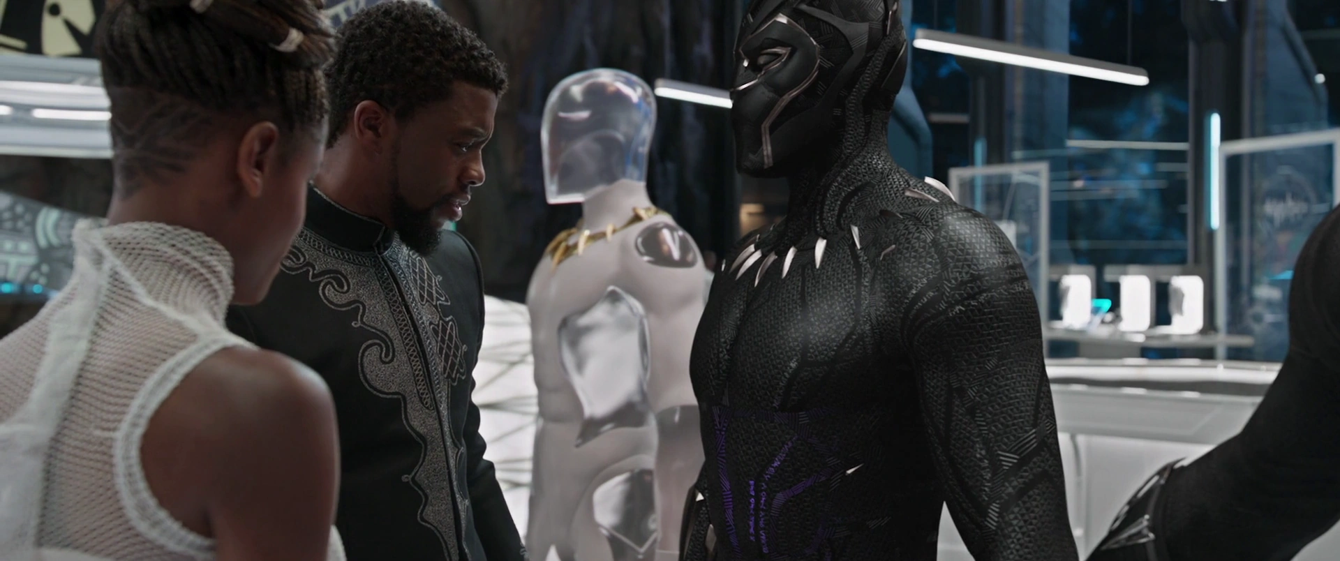T'Challa was then introduced to a model with a golden necklace, but T'Challa proposed the idea to not be seen, so he decided to pick the model with a silver necklace. Shuri then asked T'Challa to summon the Panther Habit, letting it materialize, stored into the necklace when not in use. T'Challa was then asked to strike it, only for Shuri to angrily yell at him. T'Challa then noticed that the suit was glowing, as he was informed that it could absorb damage and emit it back for redistribution.