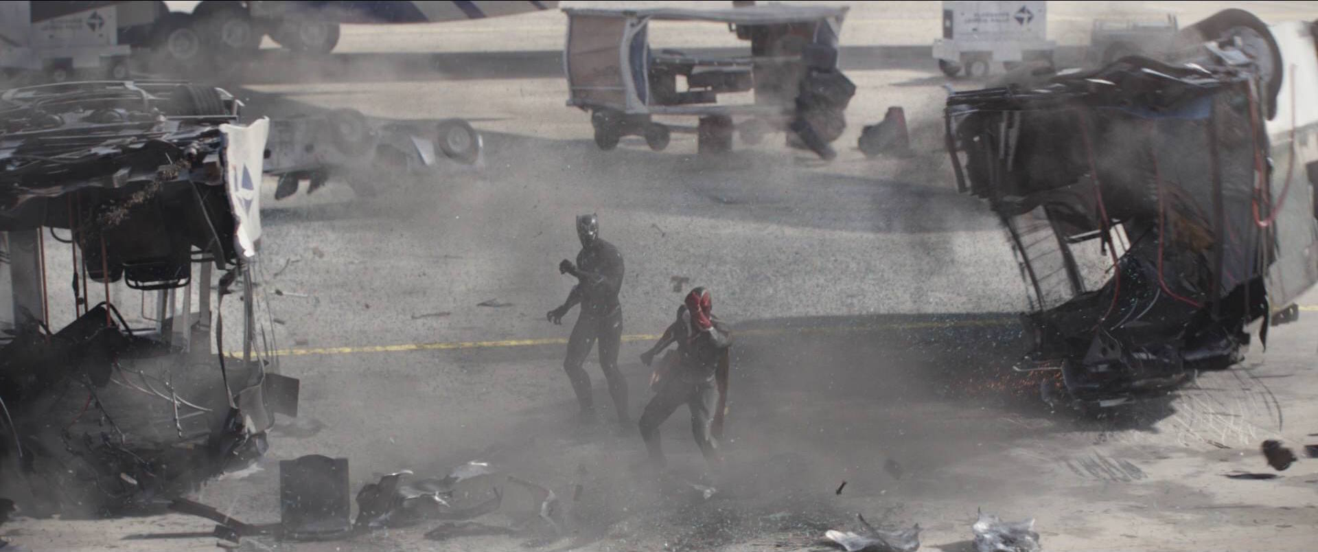 T'Challa teamed up with War Machine during the fight but they both proved to be bested by Captain America, who fought them both off while disarming War Machine's weapons. The fight was stopped when Captain America and Ant-Man used a Pym Particle Disc to enlarge and throw a large fire truck towards T'Challa, War Machine and Black Widow, much to their annoyance as both T'Challa and Widow managed to dodge the explosion while Rhodes was hit with full on the force, knocking him painfully backward.