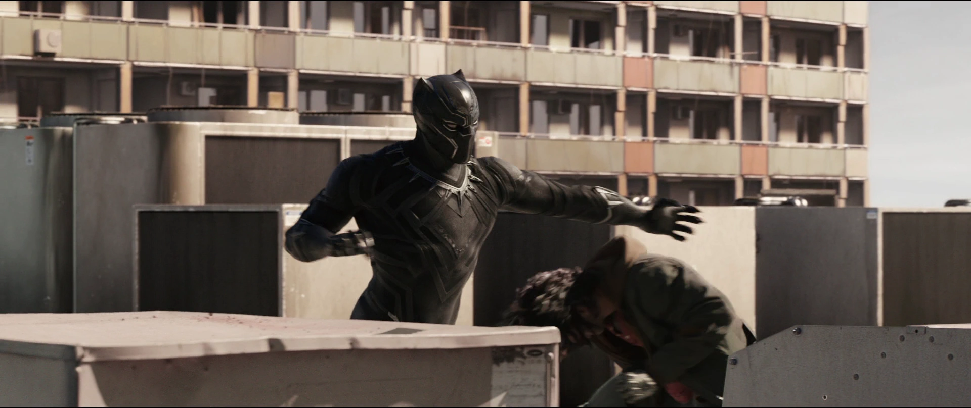 Using the incredibly sharp claws on his suit, Black Panther slashed at his enemy and tried to kill him, eventually pinning him to the ground and attempting to stab his target through the throat. When all hope looked lost for the Winter Soldier their battle finally stopped when a GSG 9 helicopter fired on Black Panther, with his own vibranium suit saving him. The Winter Soldier then attempted to escape by running off the side of the building, only for Black Panther to follow, grinding down the building's side.