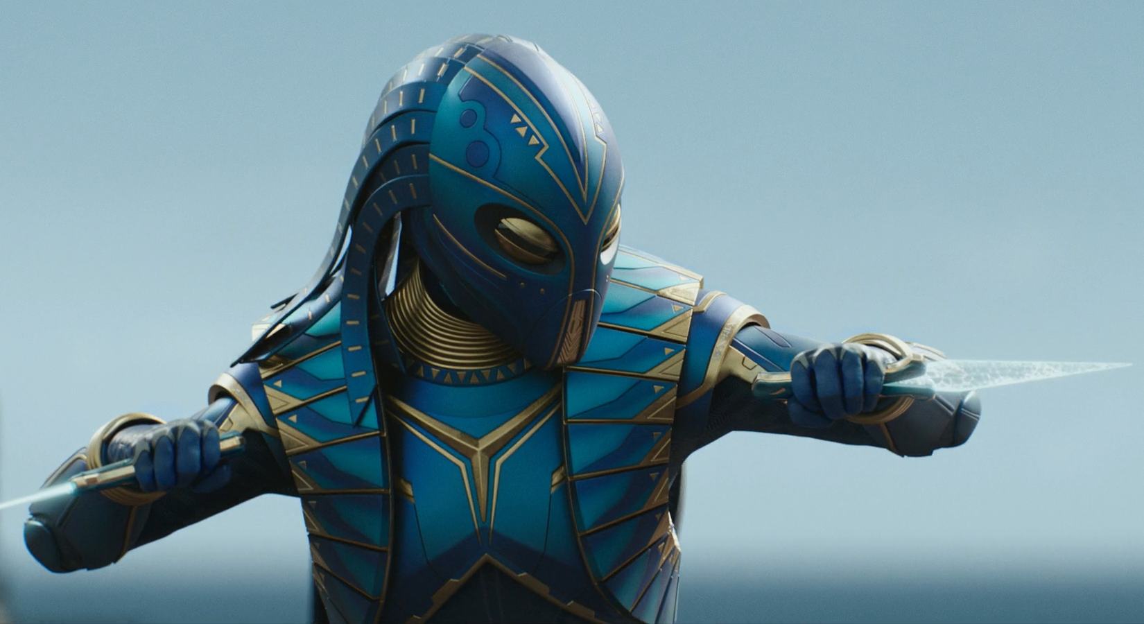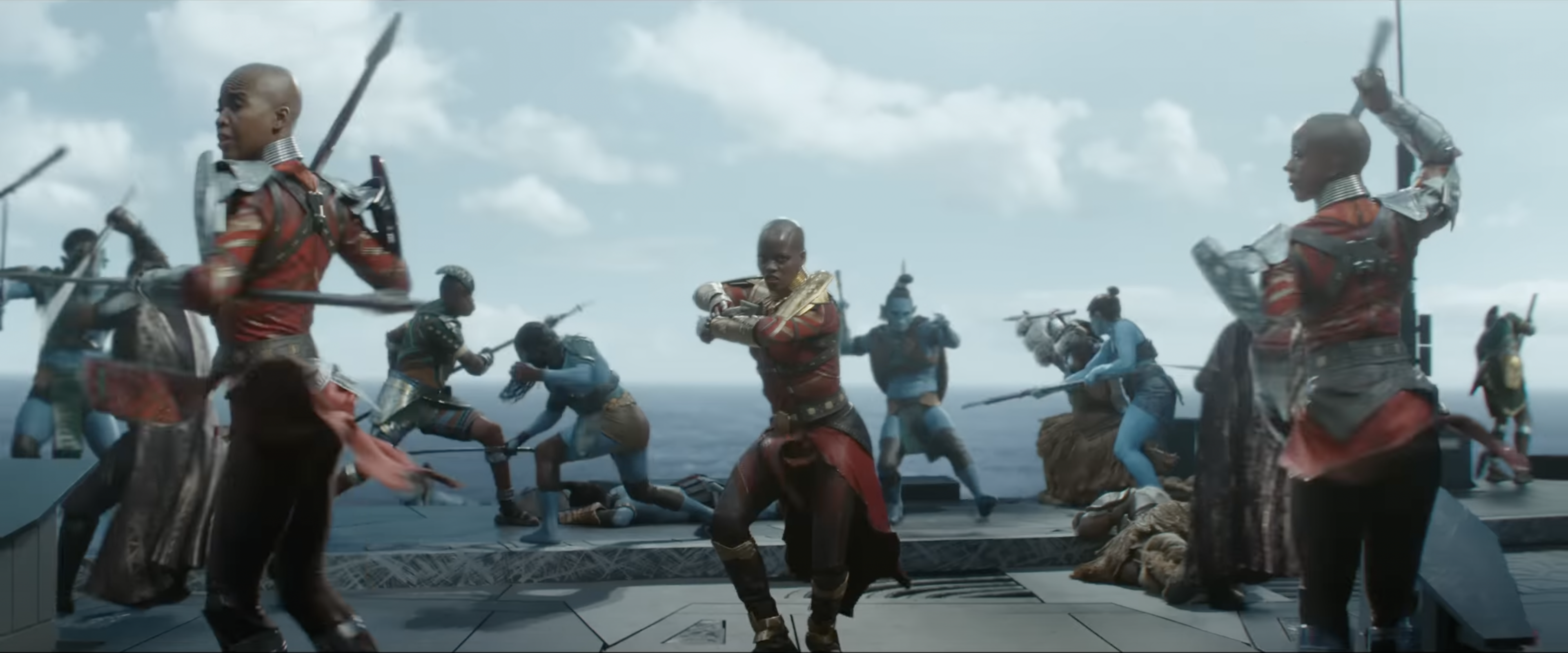 Okoye and Nakia started helping civilians get to safety as Shuri and Aneka started manning the Sunbird, to pick up civilians out of the water. Ramonda and Riri Williams also helped by controlling the machines from the Citadel. The first responders ran to their ships only for the Talokanil to use their hypnosis to force them to jump into the water. The Dora Milaje, now led by Ayo, ran into action, taking a grenade and launching it into the water at the Talokanil.