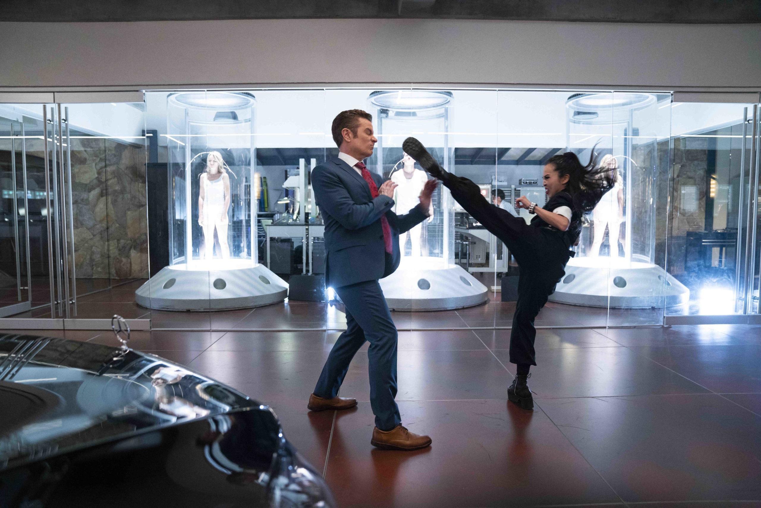 Shortly afterwards, Chase, Janet and Karolina are able to reunite in the simulation. They locate their way out of the simulation, but have to wait until the door is unlocked by Wilder. However, the Magistrate manipulates the Algorithm from the outside to slowly choke Chase. Using her powers, Karolina is able to counter the action, although she nearly vanishes in the process. Before the Magistrate can react, Minoru attacks him while Alex works on unlocking the door. In the ensuing fight, the Staff of One is seemingly destroyed.