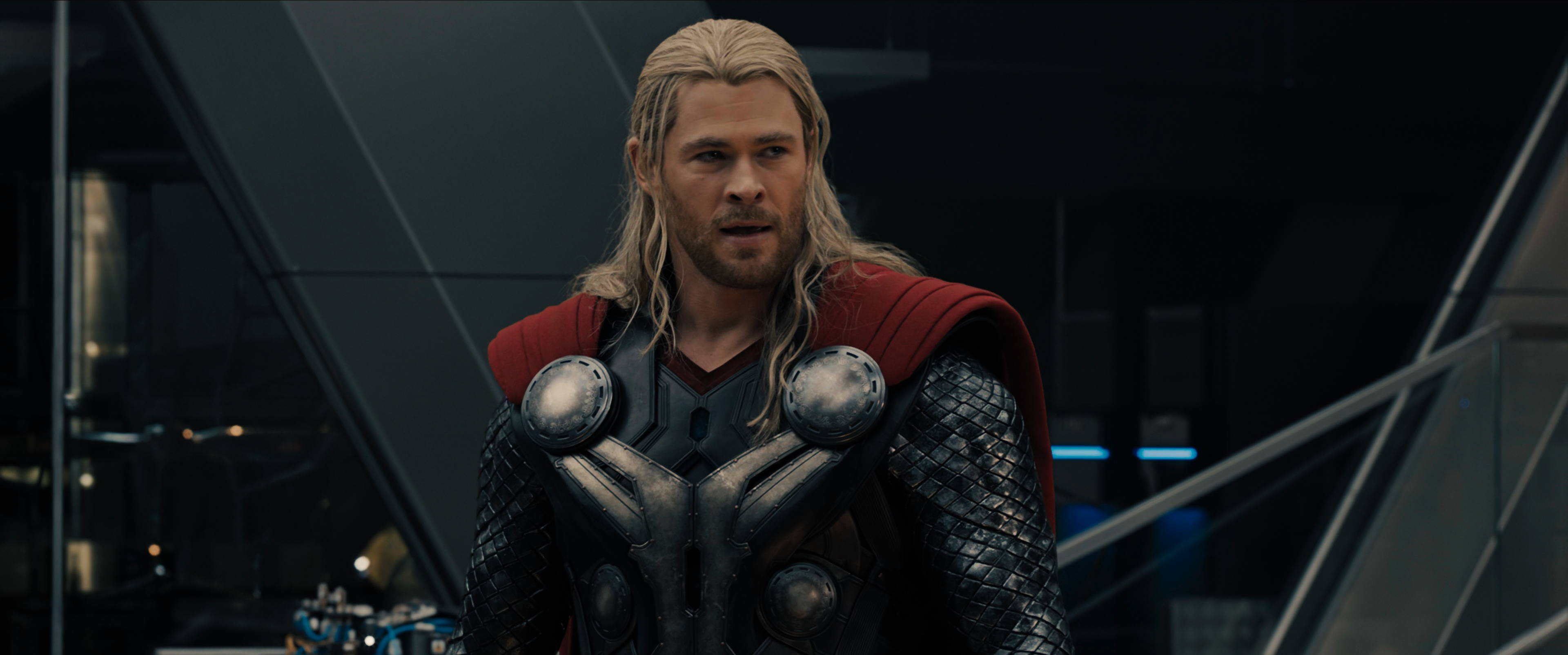 Second Set: Thor's second set of armor worn while fighting in the forest with Captain America and Iron Man. It was sleeveless with a black top covered in silver plates. It has blue pants and black boots. It had red wristbands covered with silver arm bracers. It also had a bright red cape. During Thor's stay on the Helicarrier he removed portions of his armor such as his cape, larger arm bracers and part of his chest plate, while in the more relaxd setting. While heading into the Battle of New York he re-donned his cape and heavier portions of his armor, adding to it a set of chain-mail sleeves as seen in the first set.
