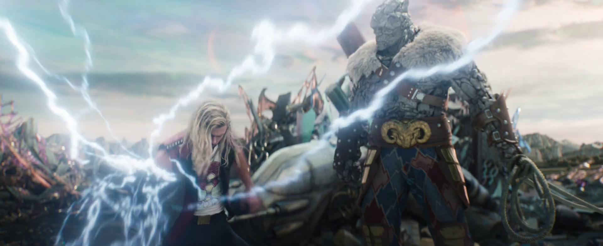 Thor was born with the ability to generate, control and project electrical energy, with him thus being the God of Thunder. Even while unable to personally harness it and needing Mjølnir to focus his powers over electricity, Thor's electric bolts were already strong enough that it was able to blacken an Aether-enhanced Malekith, take down two Chitauri Leviathans and a large amount of the aliens and his electrical powers was already potent enough that Thor could generate incredible enough levels of electricity as to help Iron Man swiftly smite the falling Sokovia City to oblivion. Following Odin's death and visions from his father's spirit, Thor finally fully unlocked his electrical powers and his powers over lightning were enhanced to the point where he can generate incredible amounts of electrical energy from his own body and summon thunder and lightning from the sky, all without the use of Mjølnir. His new ability allows him to seamlessly integrate lightning into his fighting sequences against Hulk in the Contest of Champions, and then later against Hela along with her undead army. He becomes able to use lightning to mimic telekinesis by wrapping enemies with lightning to pull and hurl them away, release smaller blasts of lightning that can reduce projectiles to pieces, and infuse his weapons with electricity. Thor's generated lightning bolts grew so powerful that he was able to easily send an enraged Hulk flying back and visibly stun him for a time and even temporarily stun and knockdown Hela herself with a single respective blast. Thor was even able to cast a lightning bolt powerful enough to destroy a portion of the Rainbow Bridge that Hela was standing on to ultimately send her crashing down into the water beneath. Wielding Stormbreaker, Thor's powers over electricity grew greatly to the point that he was able to generate a lightning blast powerful enough to knock Thanos back a considerable distance and using all his power, was able to charge the Stormbreaker so powerfully that he was able to throw it with enough power to quickly slice through a beam fired from the completed Infinity Gauntlet, although Thanos was off-guard and did not use the Infinity Gauntlet to its full power, and grievously injure Thanos in a single strike, with Thanos himself saying that Thor might have been able to kill him had he aimed for the head. By the end of his time as a member of the Guardians of the Galaxy, Thor's thunder-telekinesis had evolved to be able to stop two moderate-sized machines and their pilots and throw them into the sky without much effort. He also developed the ability to unleash wider streams of lightning upon either his lightning-imbued fist or Stormbreaker hitting a target to simultaneously destroy multiple enemies as well. A lightning blast from Thor using Stormbreaker was also enough to keep Gorr using the Necrosword to block it unable to press forward and eventually push him back.