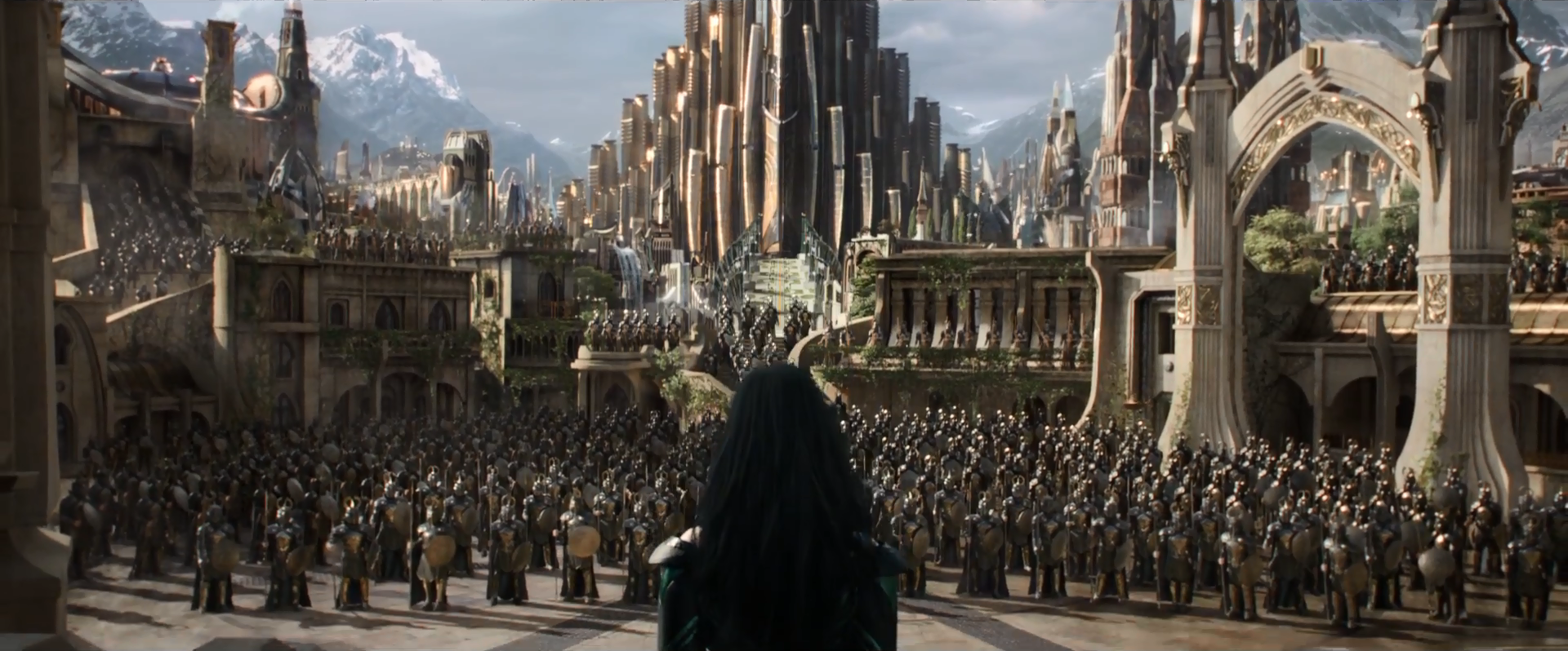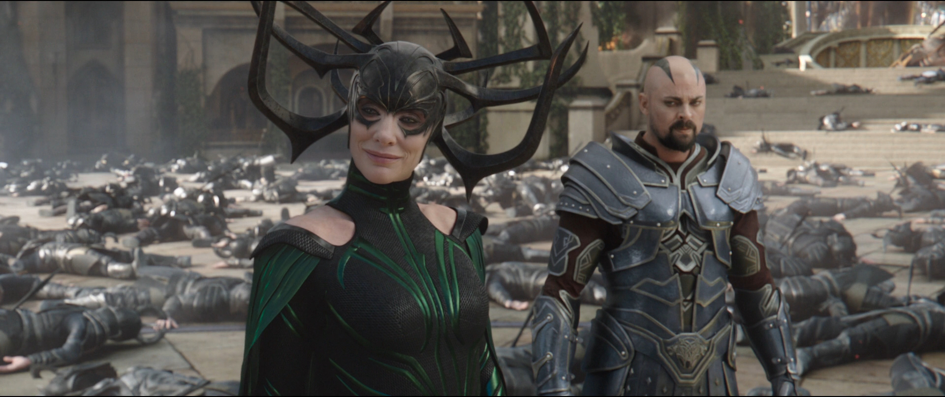 While sitting in her throne, Hela notes that when Odin was king, she was his executioner, and that now she is queen, Skurge is her executioner. Meanwhile, Heimdall sneaks into the Bifrost dome and steals the sword, rendering the Bifrost useless. It’s revealed that Heimdall has been slowly organizing a resistance against Hela. Without the sword, Hela’s cannot complete her conquest of all the realms, and she sends her soldiers to hunt down this resistance.