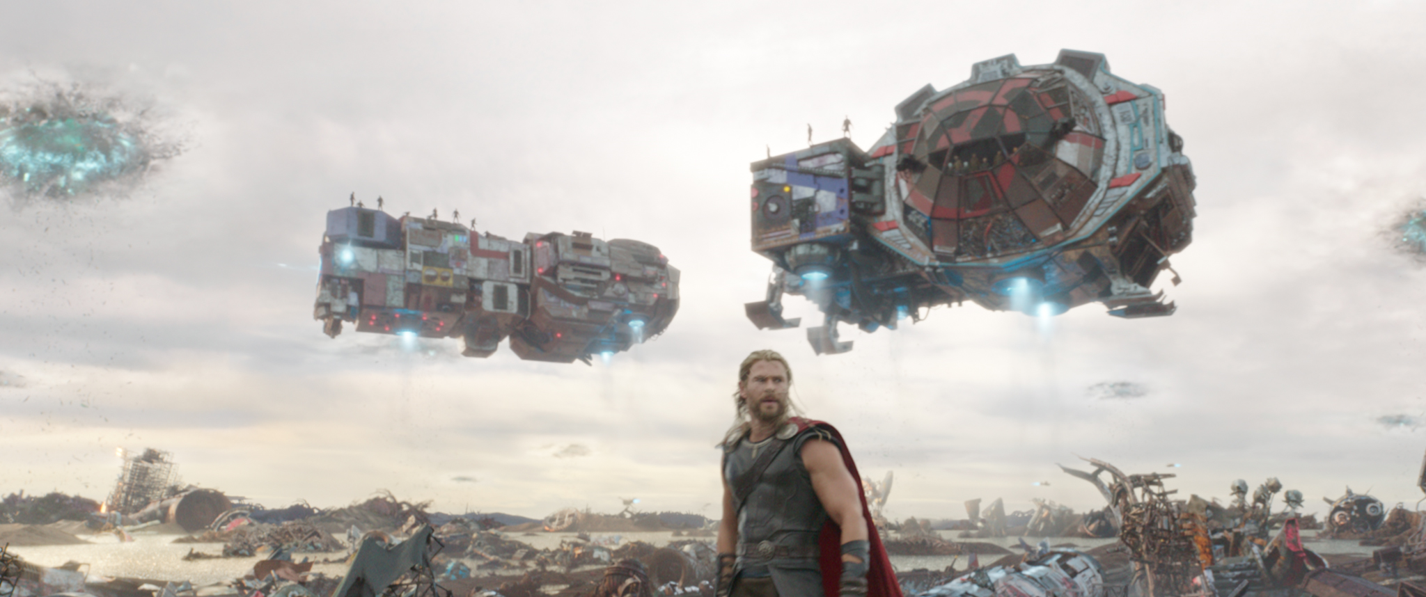 Meanwhile, we find Thor, deposited on an alien planet covered in junk: Sakaar. There are portals and wormholes of different shapes and sizes all across the sky, from which junk and debris from other worlds fall through to the surface. Thor is approached by hostile scavengers, who he manages to fight off without Mjølnir until one of the scavengers uses an electrified net to capture him. The scavengers proceed to beat Thor until a spaceship lands near them.