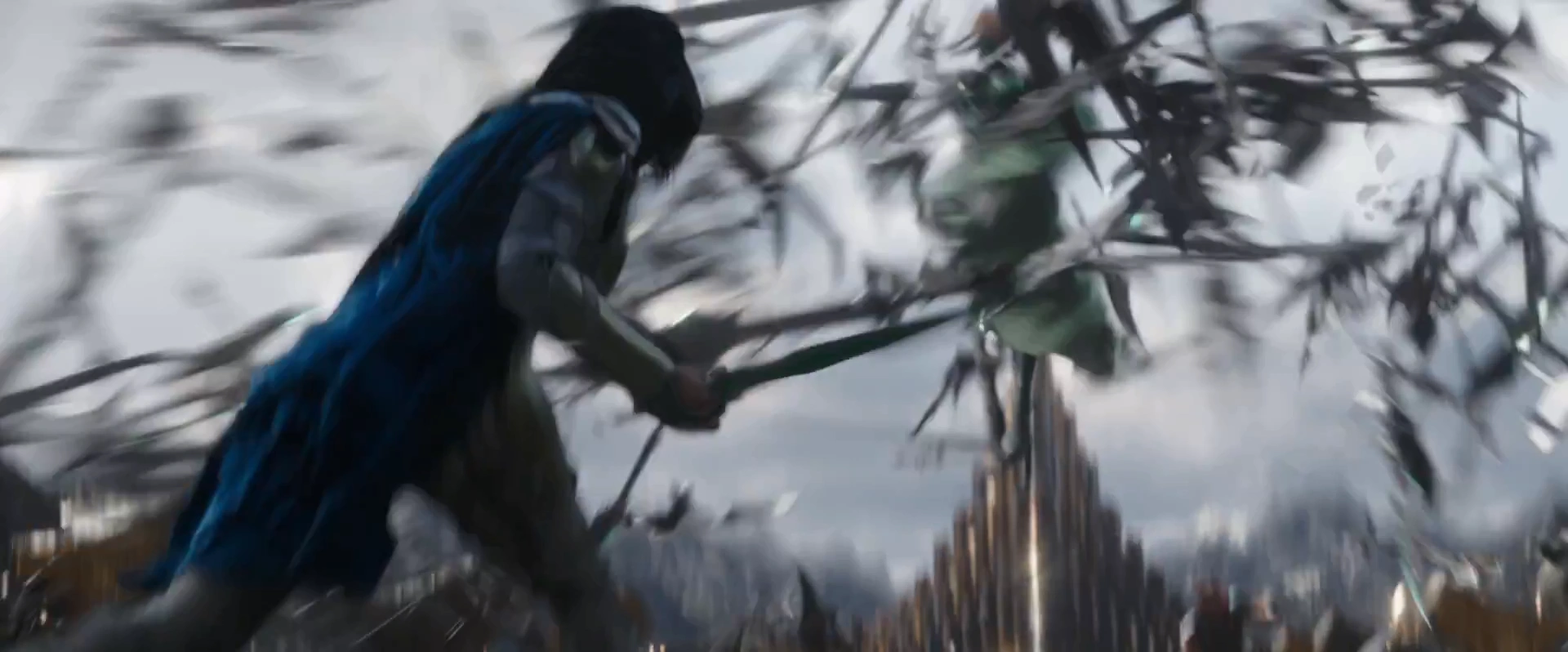 Gorr conjured more Shadow Monsters, so Valkyrie and Mighty Thor went to fight them off while Thor dealt with the God Butcher. Using Thunderbolt, Valkyrie managed to kill the creatures, and she and Mighty Thor went to assist Thor with fighting Gorr. Valkyrie then found herself facing off with Gorr by herself, which resulted in him using the shadows to sneak up behind Valkyrie and stab her. Mighty Thor carried Valkyrie to safety, and Thor summoned the Bifrost Bridge to get them home, but Gorr was able to steal Stormbreaker.[3]