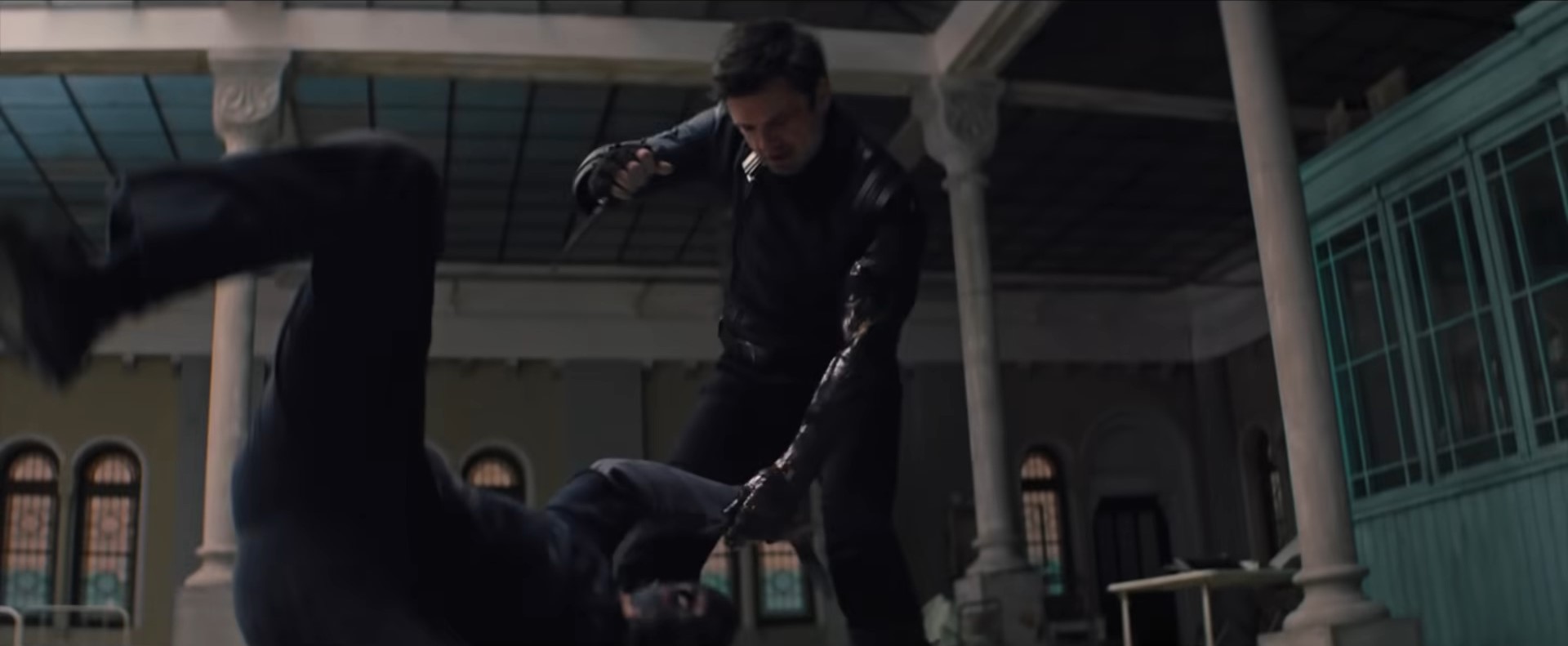 Still under the control of Hydra, Winter Soldier traveled to eliminate another target at the Hotel Inessa, who was guarded by a personal selection of his bodyguards. Winter Soldier began his attack on the guards by punching his metal arm through a wall, grabbing a guard and quickly disabling him, before throwing a blade at the next guard, and shooting the next two before they could realize what was happening. With his target fleeing, Winter Soldier leapt off the balcony to get ahead of him.
