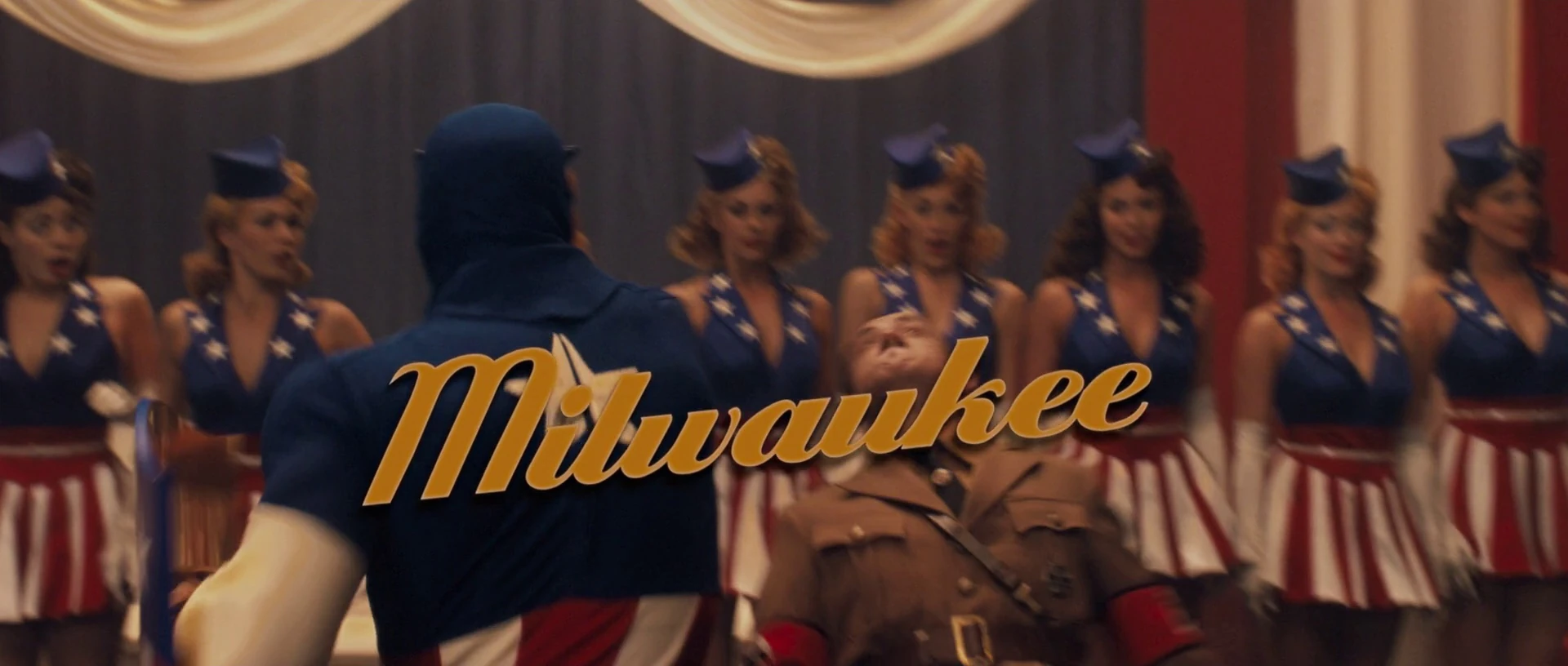 Rogers joined the USO and began touring the nation in a colorful costume as "Captain America", accompanied by a chorus named the Star Spangled Singers, Milwaukee being one of the many cities visited.